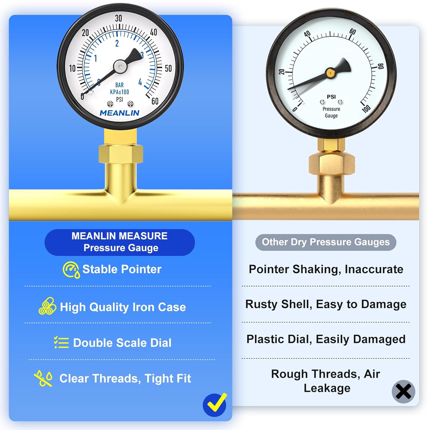 MEANLIN MEASURE 0-60Psi 2" DIAL FACE 1/4" NPT Well Pump Pressure Gauge, with 1/2" NPT and 3/8" NPT Hex Bushing, Pool Sand Filter WOG Water Oil Air Pressure Test, Lower Mount (Pack of 2)