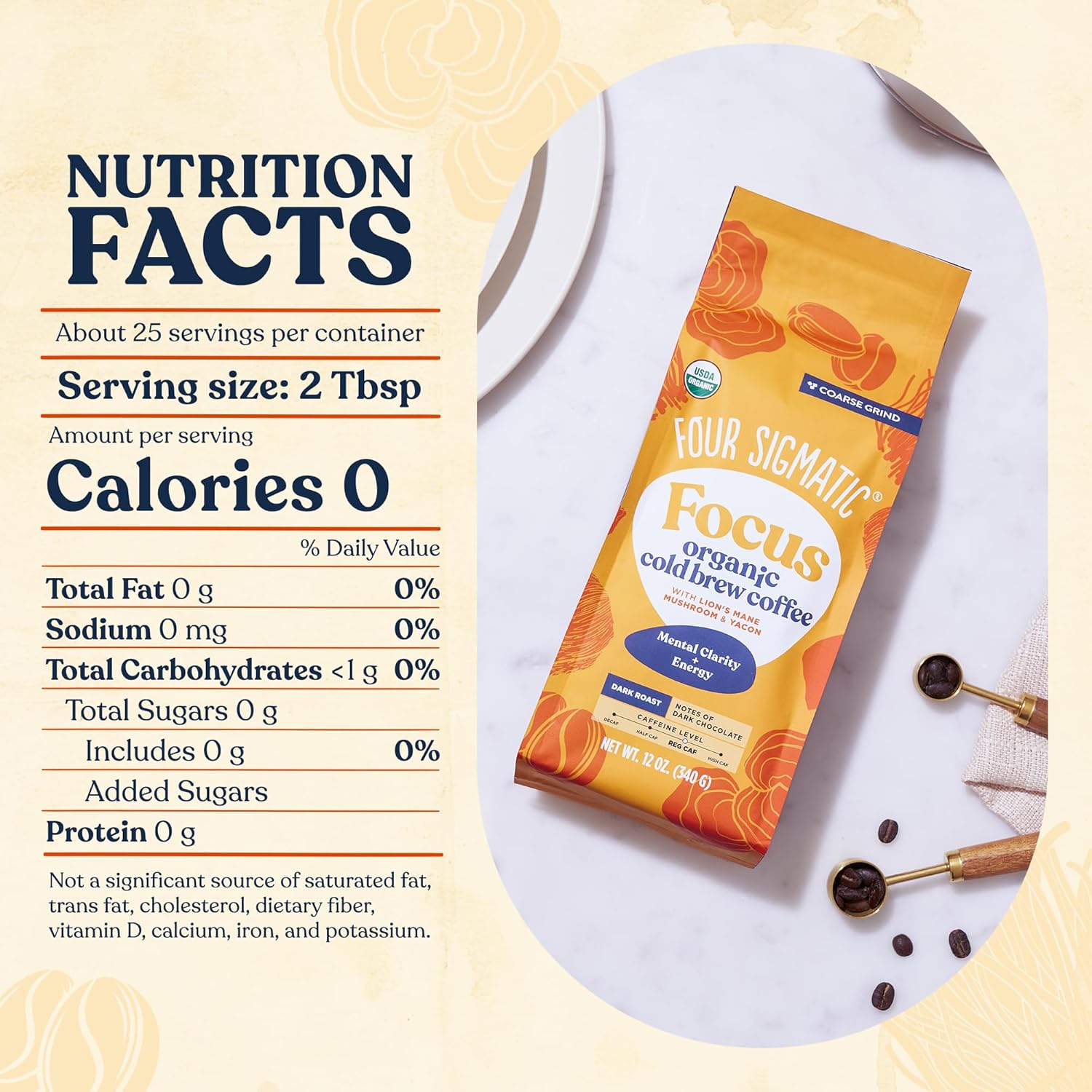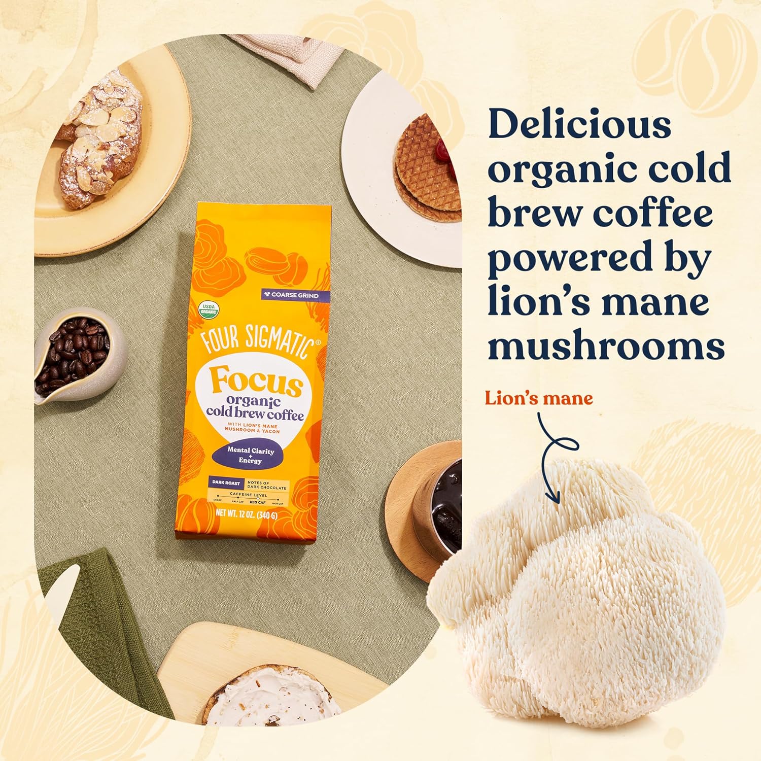 - THE BENEFITS OF COMBINING LION'S MANE MUSHROOM WITH COLD BREW COFFEE — Experience a refreshing twist on your coffee routine with our coffee grounds for iced coffee enriched with 250mg of organic Lion's Mane per serving. Lion's Mane, a functional nootropic mushroom, has been used for centuries worldwide to enhance focus and creativity. When combined with our delicious organic dark roast coffee, it provides a smooth and crash-free source of energy and concentration for hours, without any jitters.