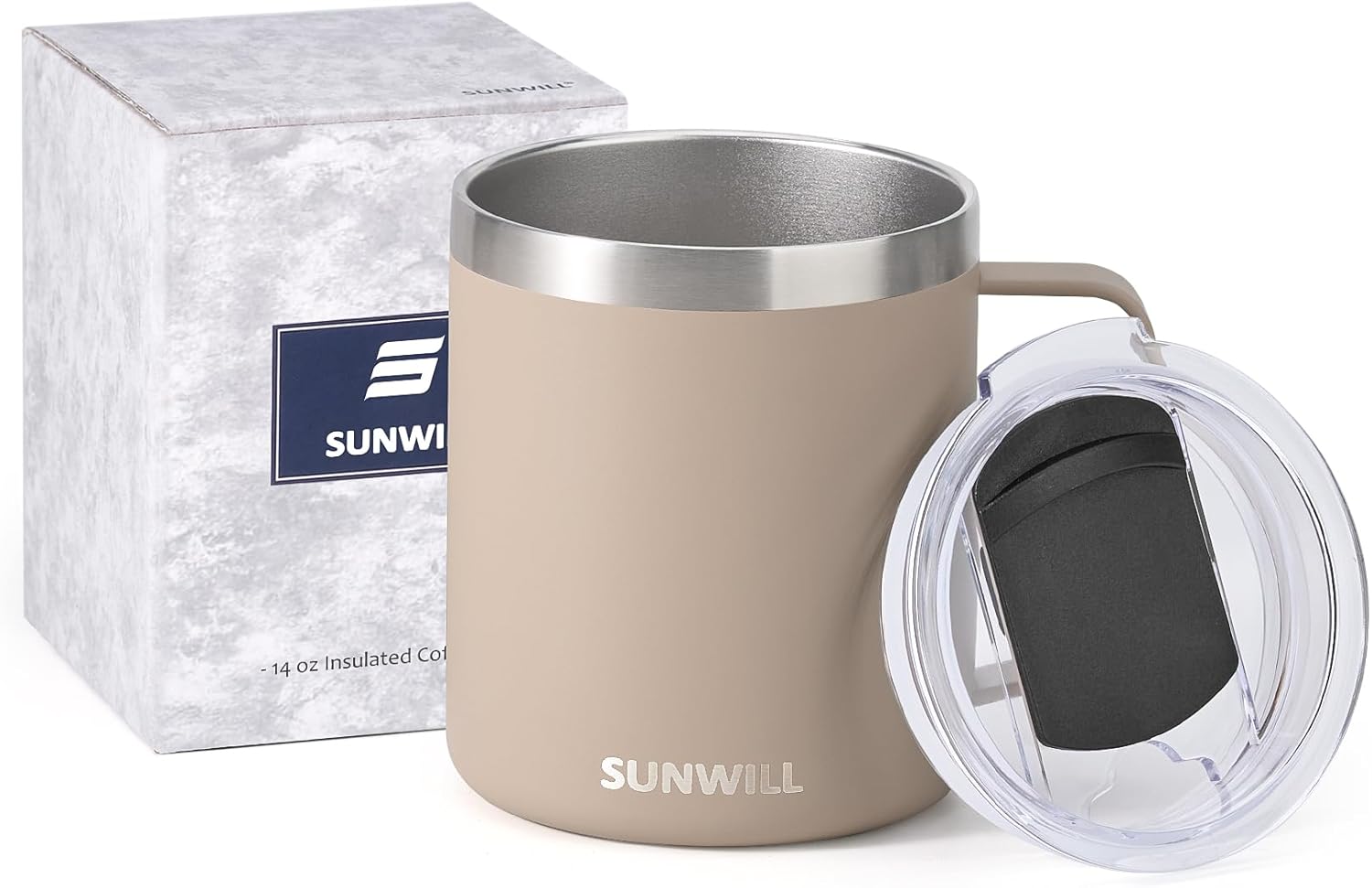 SUNWILL Travel Coffee Mug with Lid, Insulated Tumbler with Handle, 14oz Stainless Steel Cup for Camping, Office, Home, Powder Coated Taupe