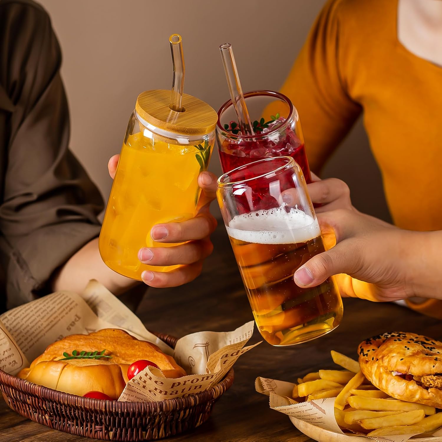 - [ENHANCED DRINKING PLEASURE] 16 oz glass cup set includes 6 glass cups, 6 bamboo lids, 6 glass straws and 2 cleaning brushes. Designed with the smooth and pleasing contours of the similar traditional aluminum can, it is definitely the ideal container for iced coffee, beer, cocktails, milk tea, soda, juice and any beverage you can think of.