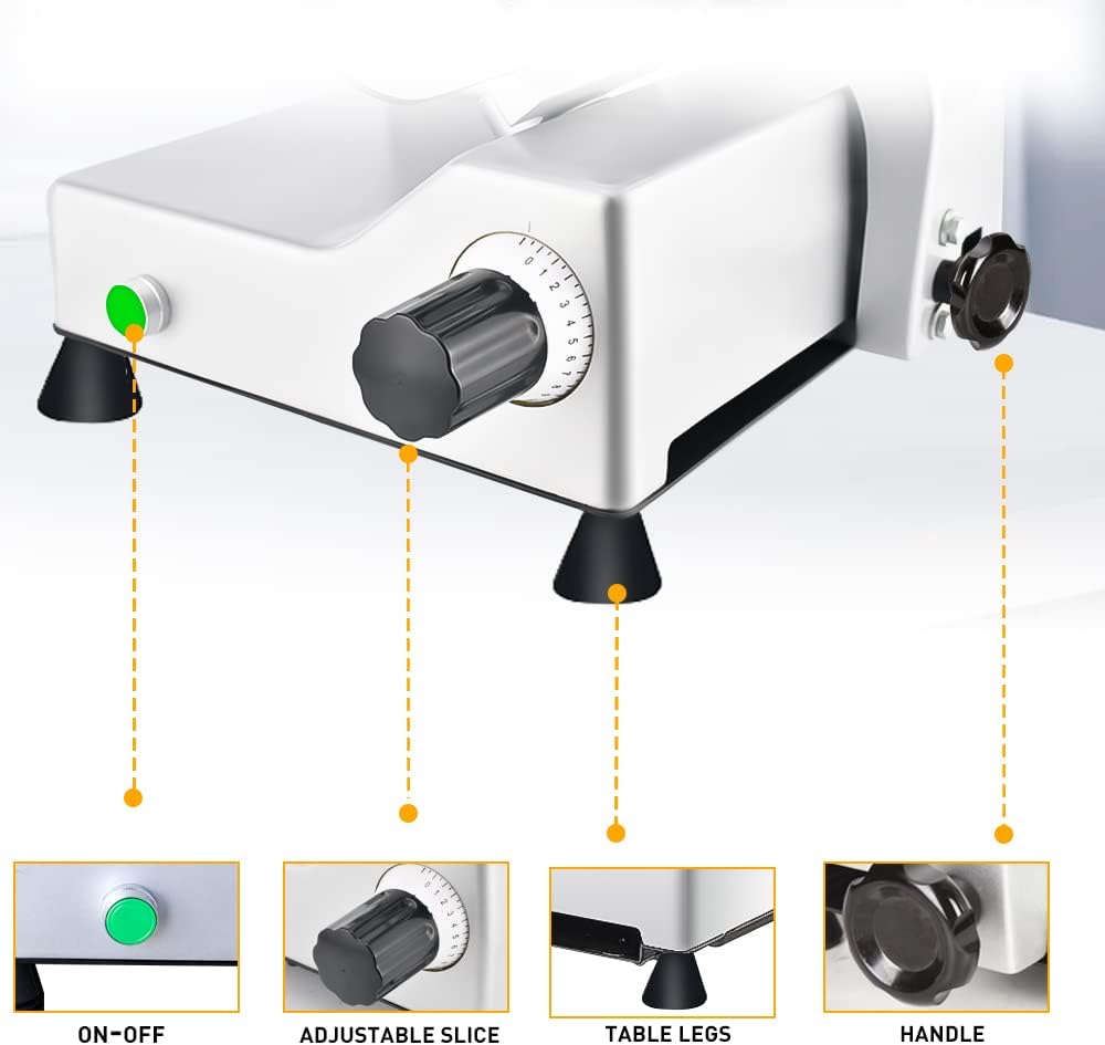 - Package and service: 1 food slicer, 1 manual, 2x cut-resistant Gloves,our company is responsible for the quality of the products. when you receive the machine can not be used normally or damaged goods, please contact us at the first time, we will handle for you immediately after receiving the information. note: overload use will affect the service life of the appliance.