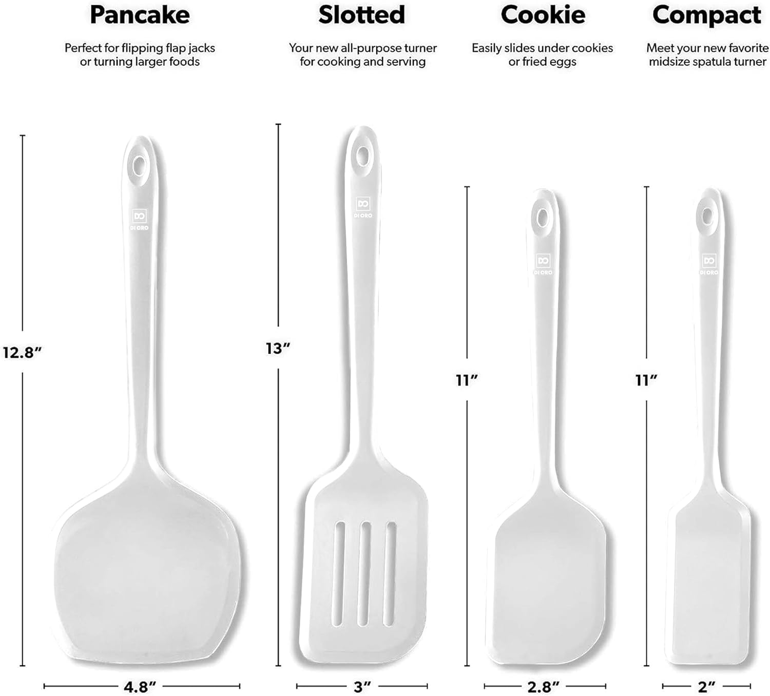 - A REVOLUTIONARY SPATULA SET - While traditional spatulas are cheap, flimsy, and easily melt when exposed to high-heat, the new DI ORO 4-Piece Seamless Silicone Turner Spatula Set is constructed with 100% pure 600ºF heat-proof and no fillers silicone. Each piece is 100% safe for nonstick cookware, and strikes the right balance between strength and flexibility. Unlike poorly designed spatulas that end up in the trash, each turner's BPA free and LFGB Certified silicone will stand the test of time