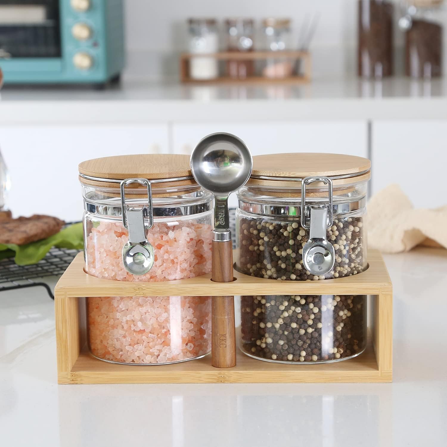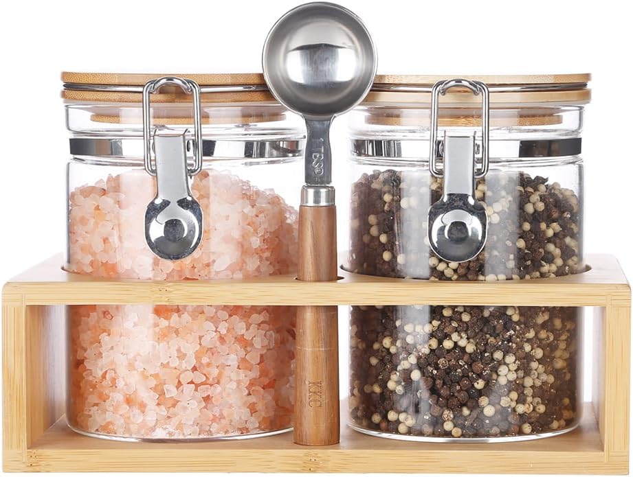 - Complete Set Includes:2 glass sealed jars (Height 5.12" x Diameter 3.9",Capacity:27floz/800ml),1 wooden handle scoops(1 TBSP),1 bamboo rack(9.45" x 4.5" x 2.76" ,L x W x H) and label stickers.
