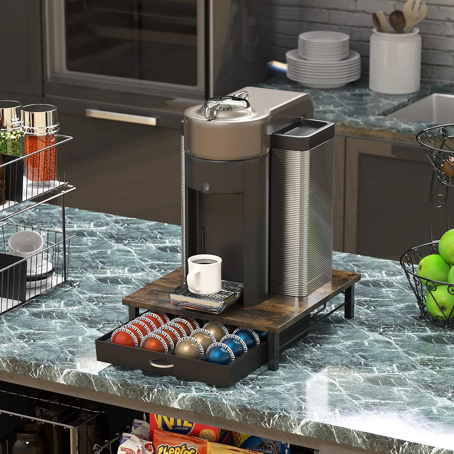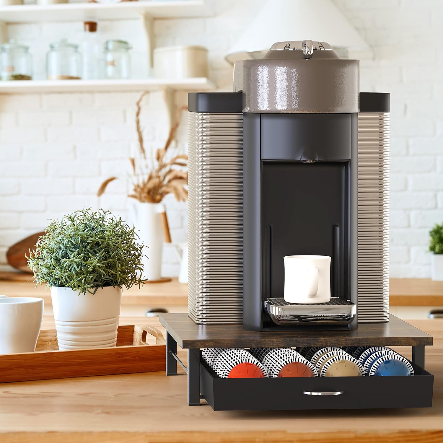 - [ Drawer Design ] Featuring a convenient sliding drawer, it allows easy access to your coffee pods while keeping them organized and neatly stored.