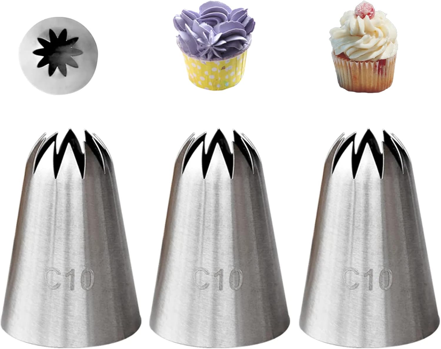 - LARGE ICING TIP for CAKE DECORATING:Contains 3 pcs C10 frosting tip(=849 piping tip),great for for decorating desserts, cakes, cupcakes, cookies, pastry dough,cookie dough,sugar craft,mashed potatoes,choux pastry,meringues,whipping cream and more.