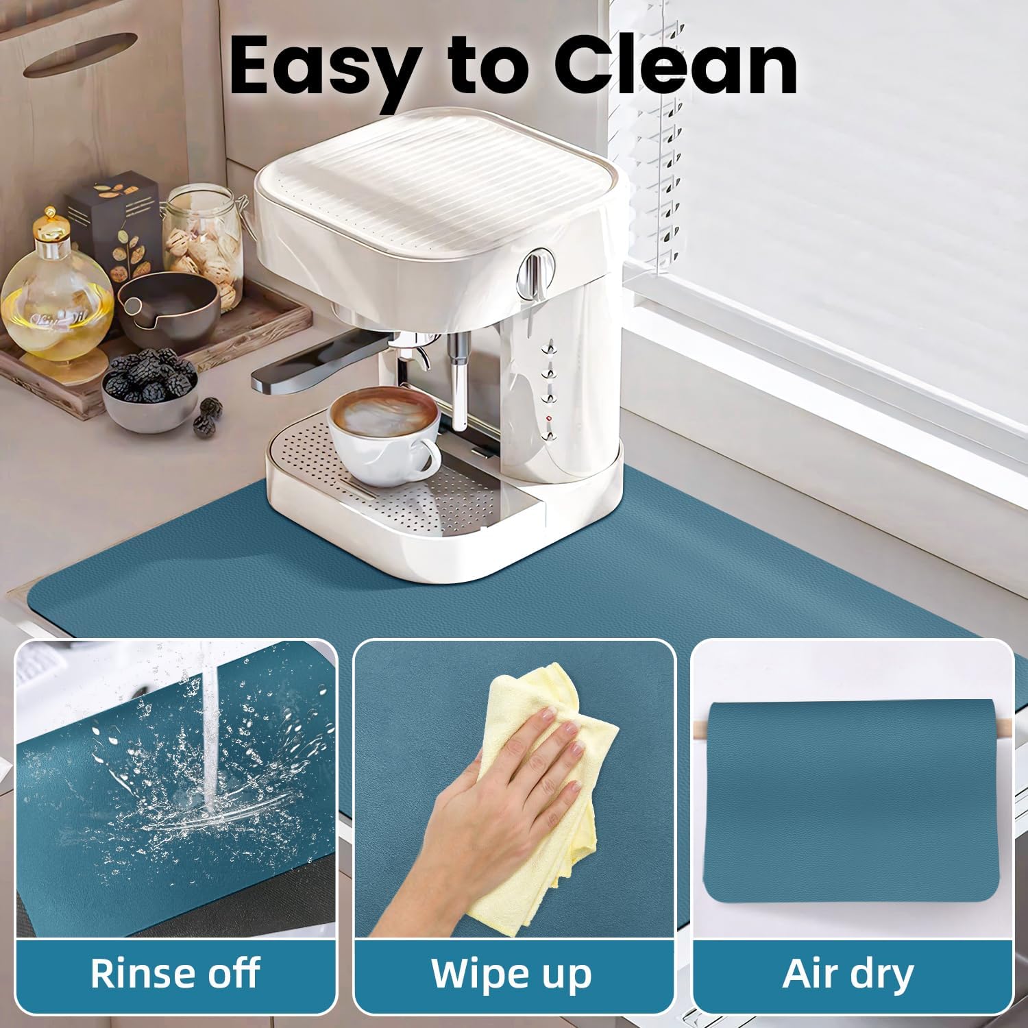 - Super Absorbent and Quick Dry: The coffee bar mats for countertop with absorbent diatomite in middle layer, which quickly absorb liquids and catch splashes. Without worrying about soiling your countertop while making coffee by using under coffee maker mat