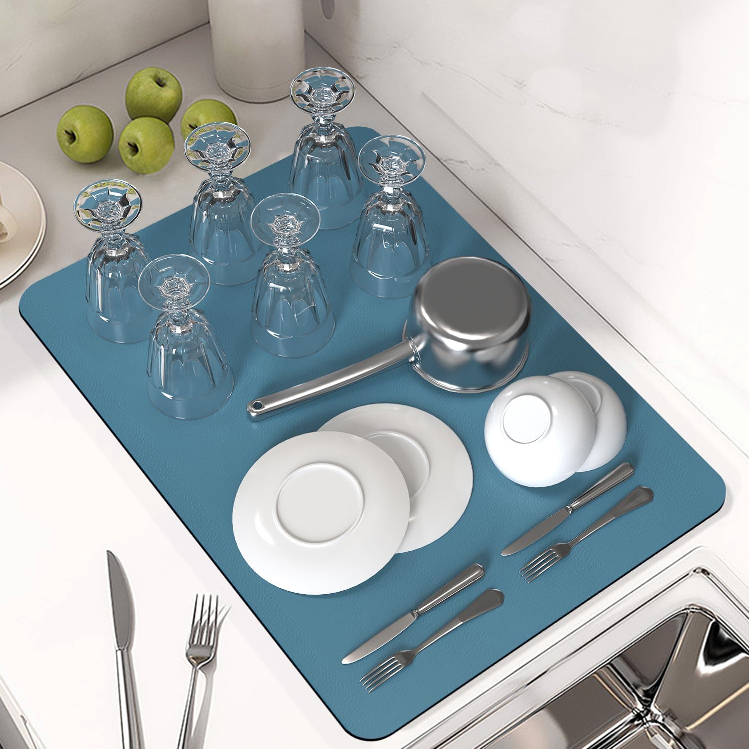 PoYang 24"x16" Coffee Mat Large, Coffee Bar Accessories for Countertop, Absorbent Dish Drying Mat, Anti-Slip and Hide Stain Pad for Espresso Machine, Espresso Maker and Kitchen Counter, Blue