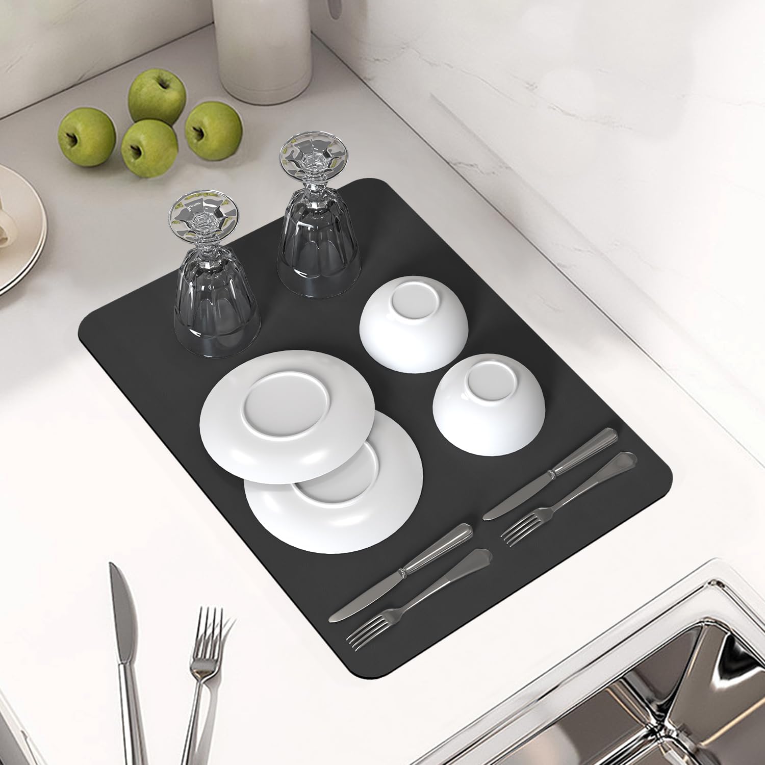 - Super Absorbent and Quick Dry: The coffee bar mats for countertop with absorbent diatomite in middle layer, which quickly absorb liquids and catch splashes. Without worrying about soiling your countertop while making coffee by using under coffee maker mat