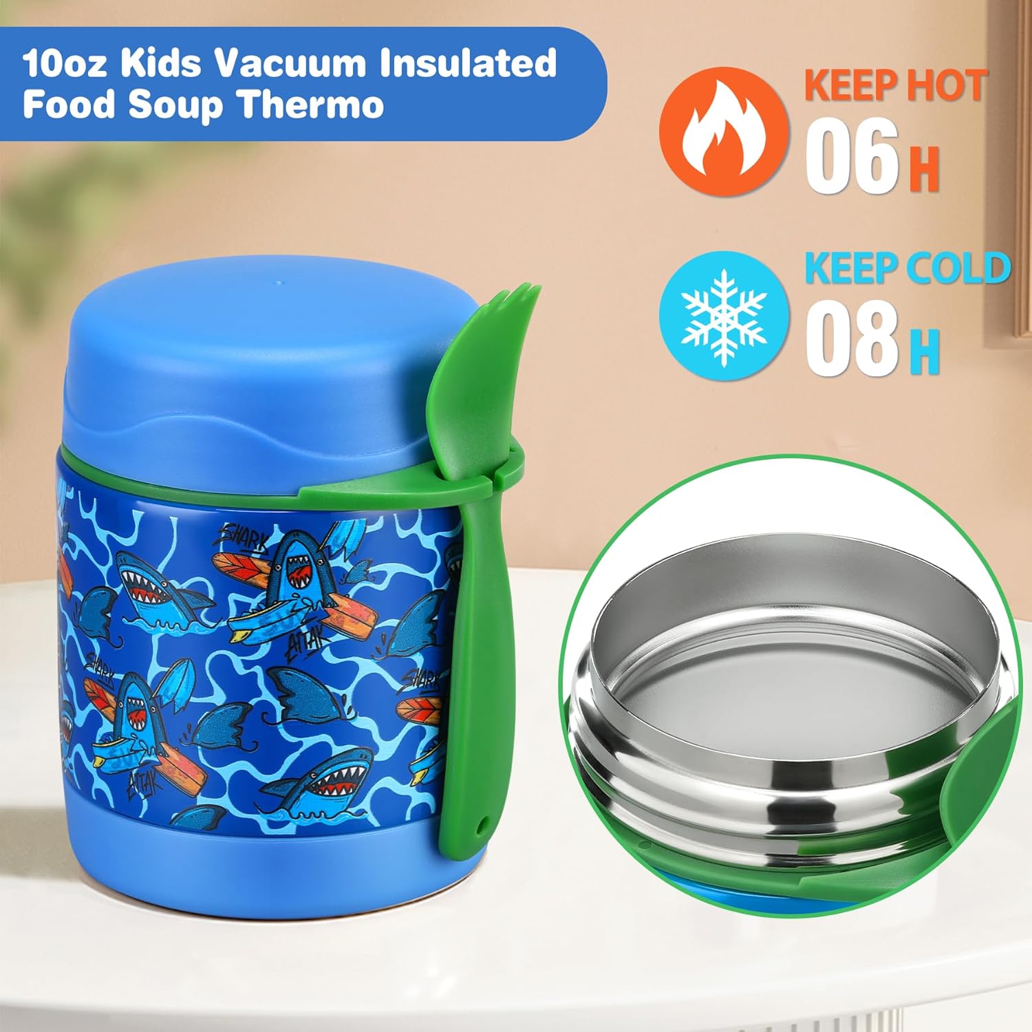 - Cute Colorful Design and Perfect Size: This lunch box and thermal cup have many patterns, which are very suitable for children, It is small enough to put it in a lunch box or the school bag. The jar comes in a 10 oz capacity, perfect for the appetites of little ones, kindergarten, kids boys and girls and baby.