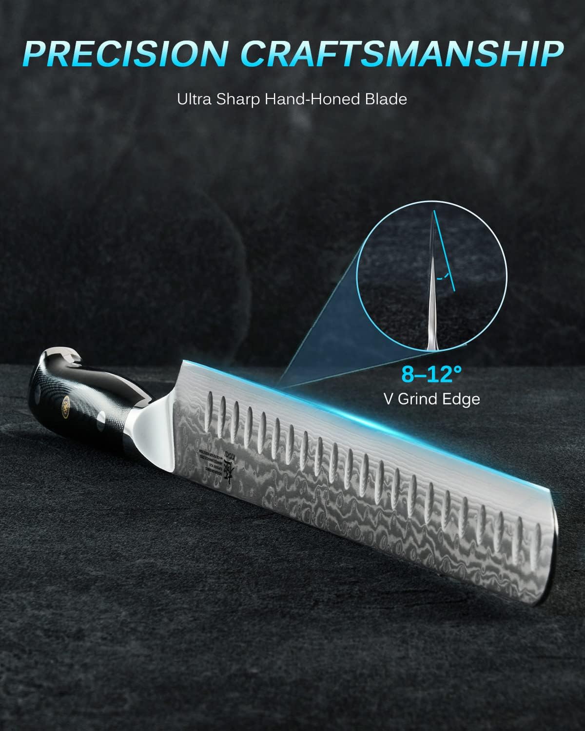 - PRECISION AND COMFORT IN ONE: Built with a 66-layer Damascus VG10 stainless steel blade and an ergonomic fiberglass G10 handle with signature mosaic pin, this kitchen knife provides both durability and balanced control for comfortable use