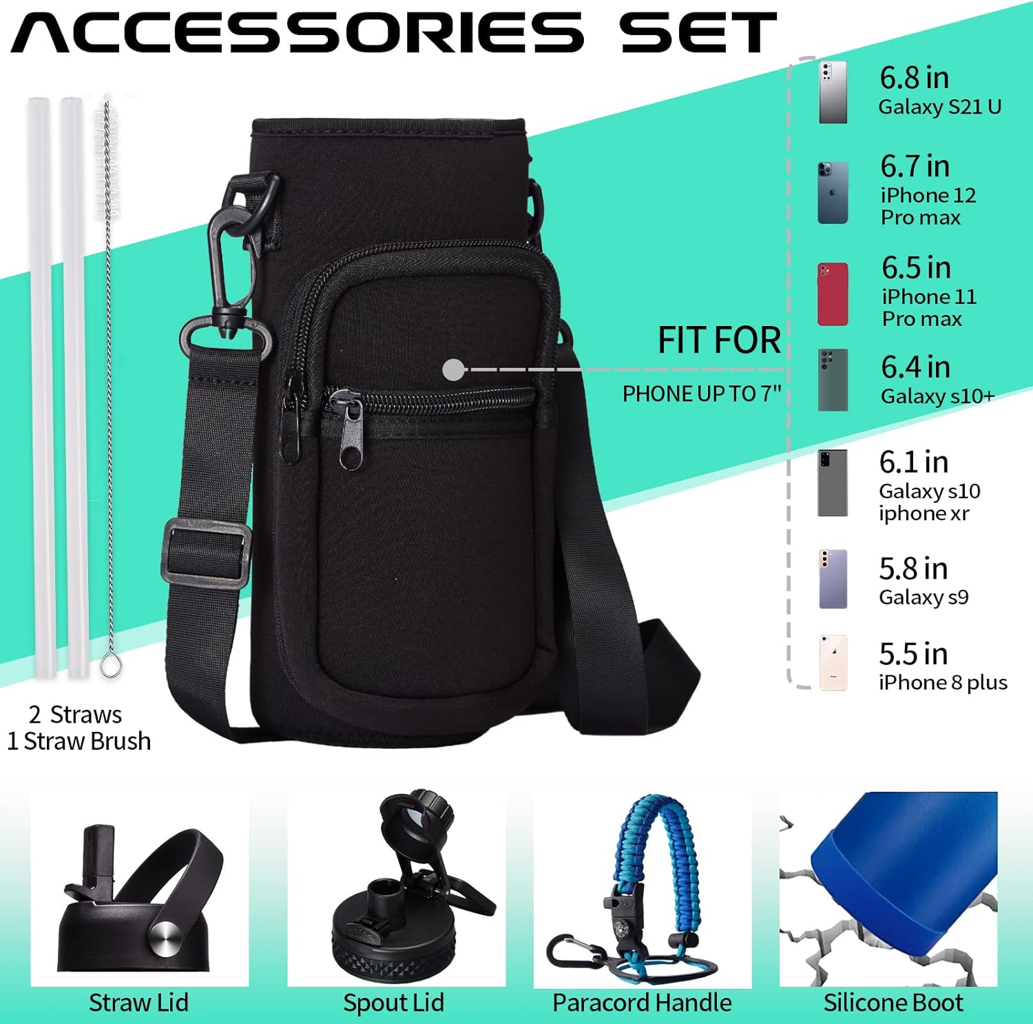 - SUPER JOYFUL COMBO: Buy 32oz insulated water bottles and get 9 accessories (2 x lids, 1 x survival paracord, 1 x carrying pouch, 1 x shoulder strap, 1 x protective cup mat, 2 x straws, 1 x straw brush). WITH A LIFETIME GUARANTEE, these thermal water bottles are perfect gifts for using at home, work, school, road trips, hiking, sporting events, or just hanging out