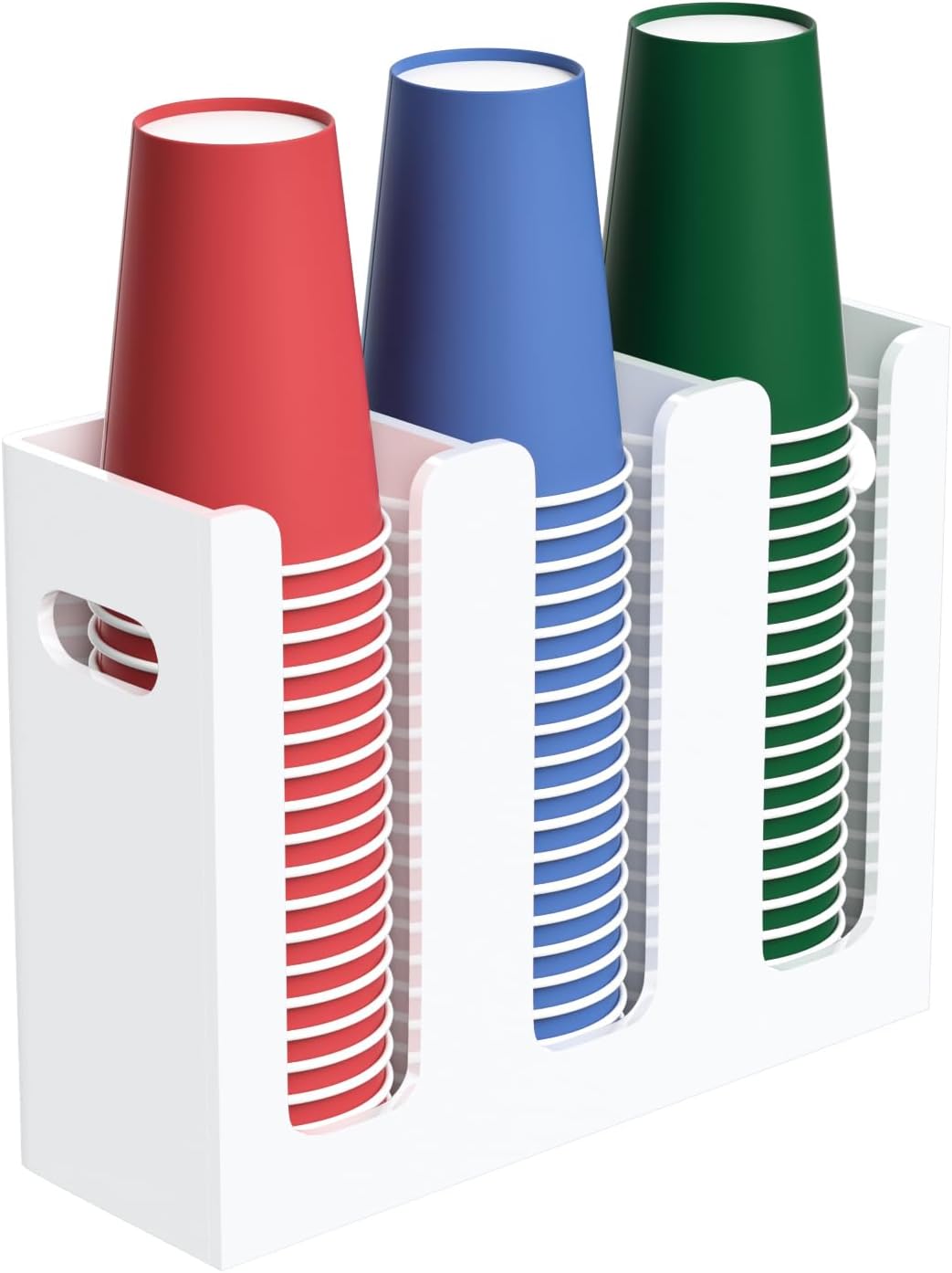 Disposable Coffee Cup Dispenser with Handles, Countertop or Wall Mount Hot/Cold Drink Cup and Lid Holder - Bathroom/Kitchen/Office Acrylic Cup Lid Storage Organizer (3 Compartments, White)
