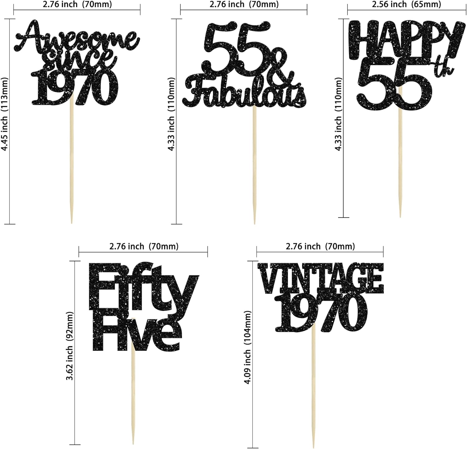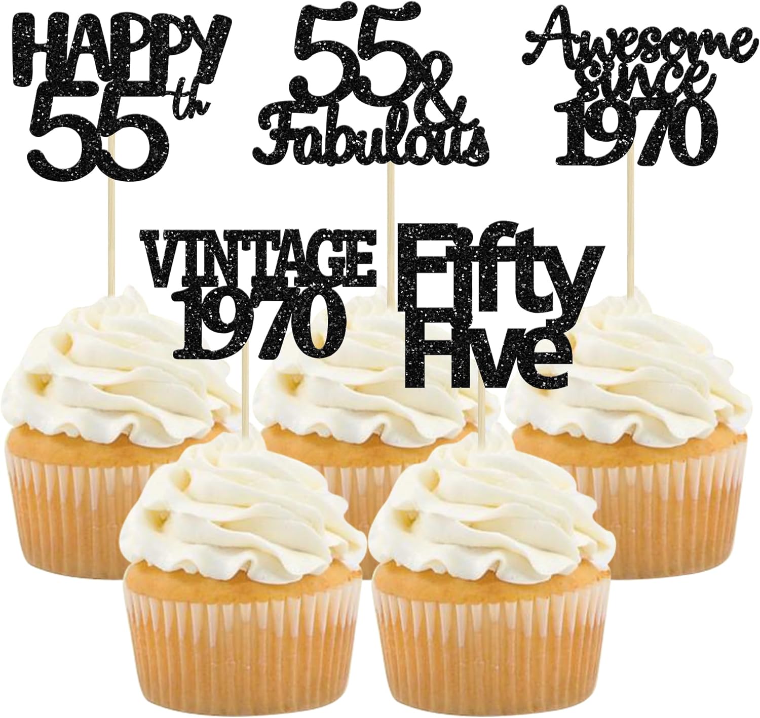 - ♡These glitter Black 55 Cupcake Toppers are so cute and good for vintage 1970 theme party, 55th birthday party, 55th wedding anniversary birthday party cake decoration. They can make your cupcake more attractive and bring the fun to your party. You can also apply them for ice cream, fruits, cookies and other desserts.