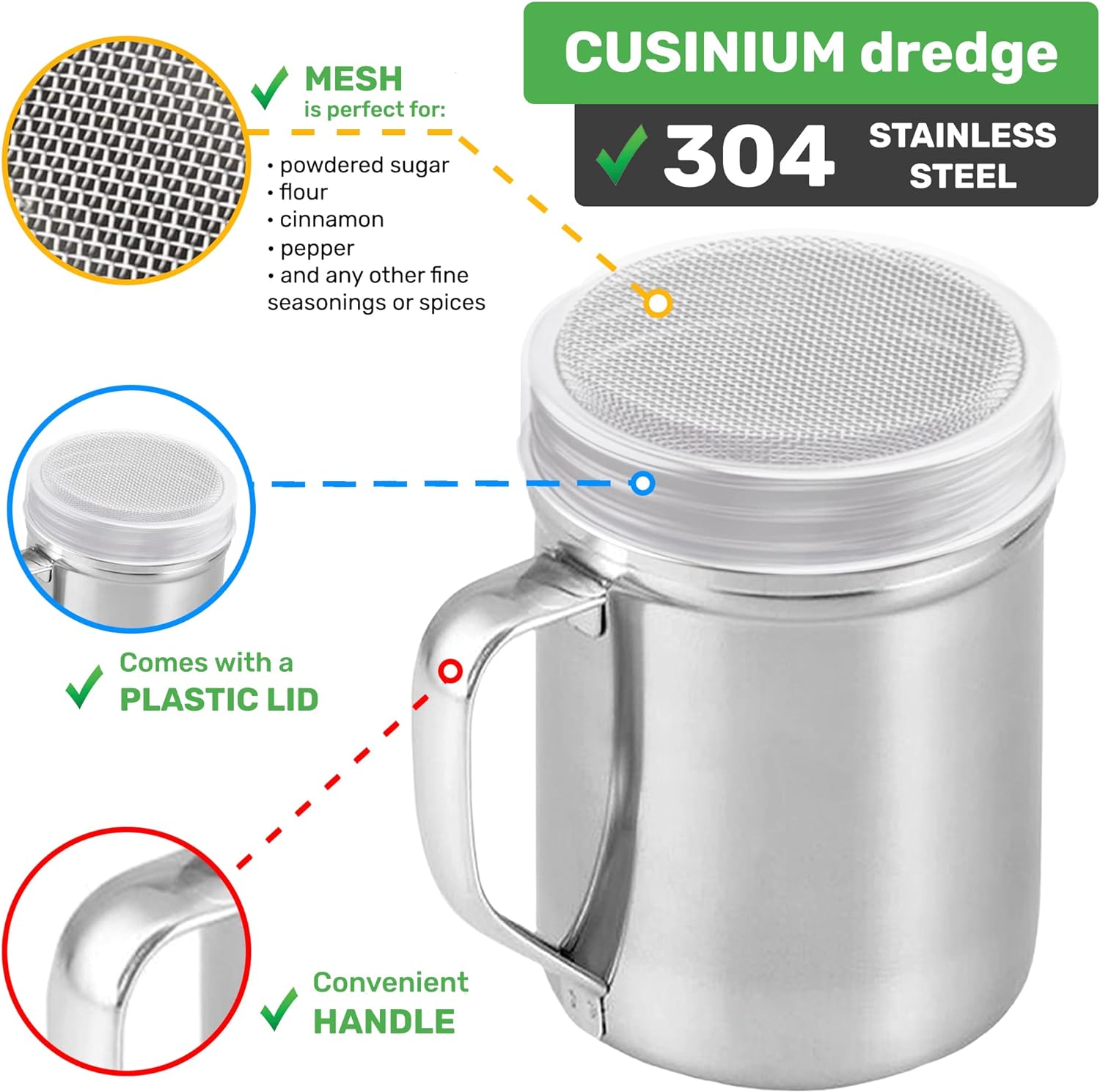 CUSINIUM Powdered Sugar Shaker Duster - With Handle - Cinnamon Shaker For Coffee Bar - Fine Mesh Dredge - 6 ounce, pack of 2 | Style: Fine