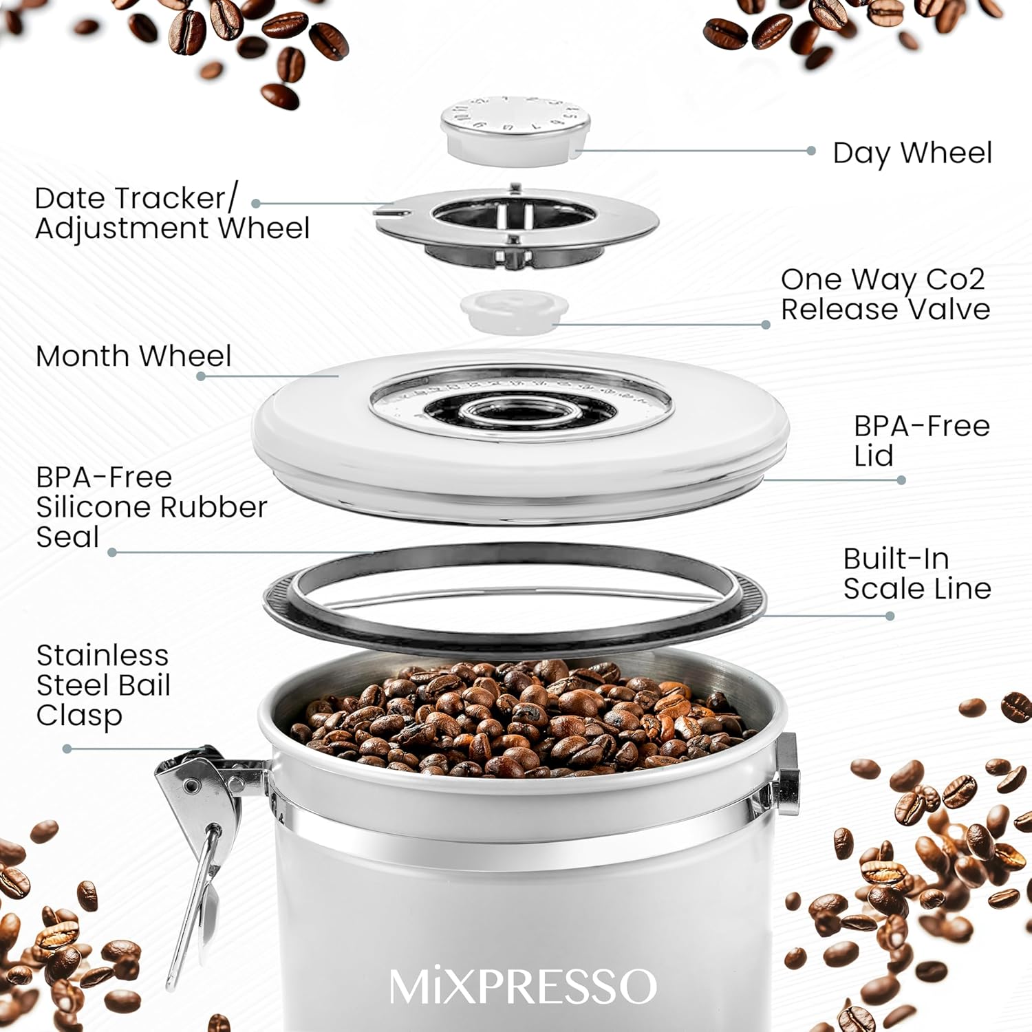 Mixpresso 16 Oz White Coffee Canister, Stainless Steel Airtight Coffee Container, Air tight Jar Tea Storage with Date Tracker, Vacuum Sealed Espresso Airtight Canister, Sugar Container for Home