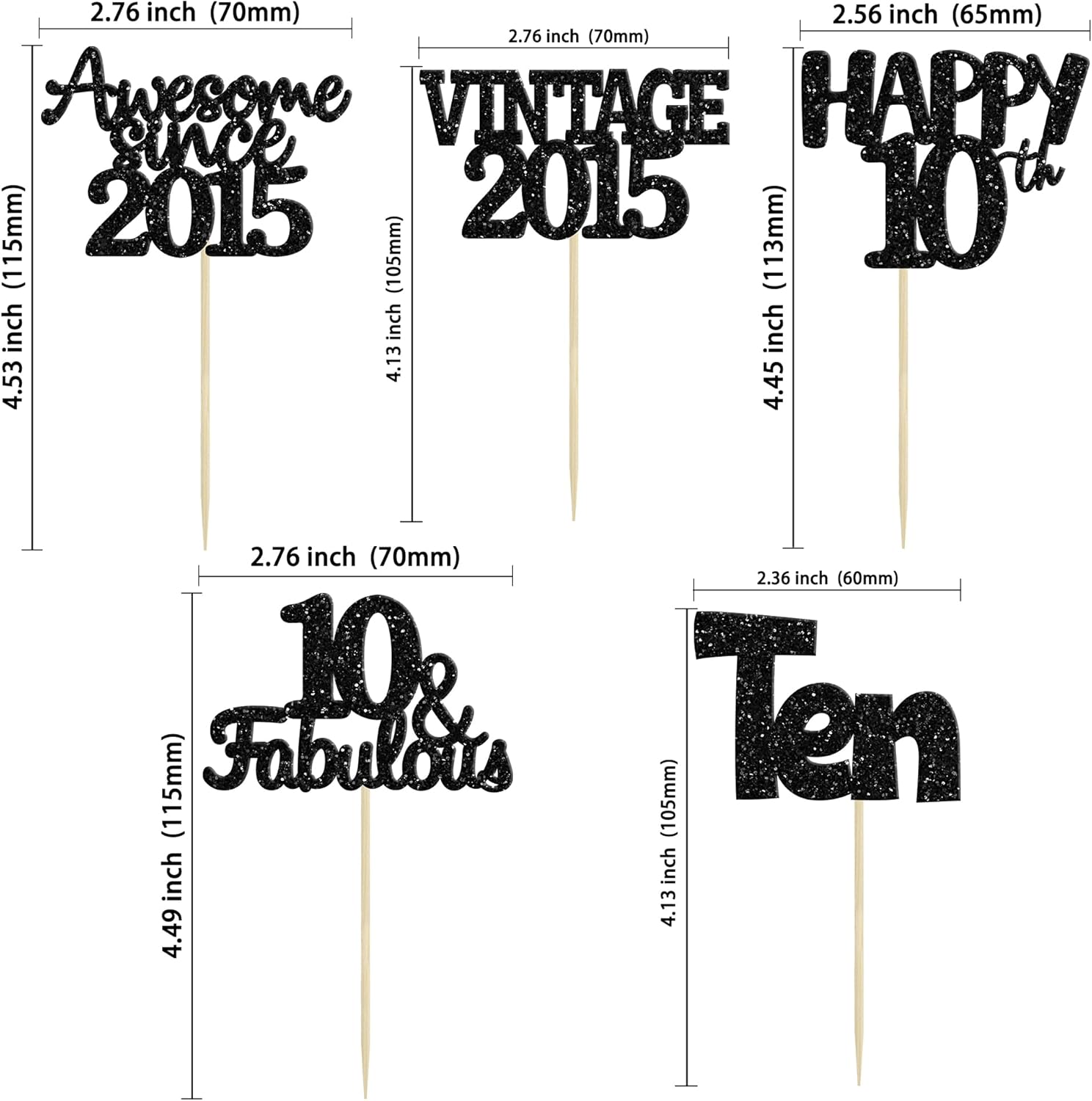 Gyufise 30Pcs Vintage 2015 Cupcake Toppers Glitter Ten Happy 10th Cupcake Picks Cheers to 10 Years Birthday Cake Decorations for Happy 10th Birthday Anniversary Party Supplies Black