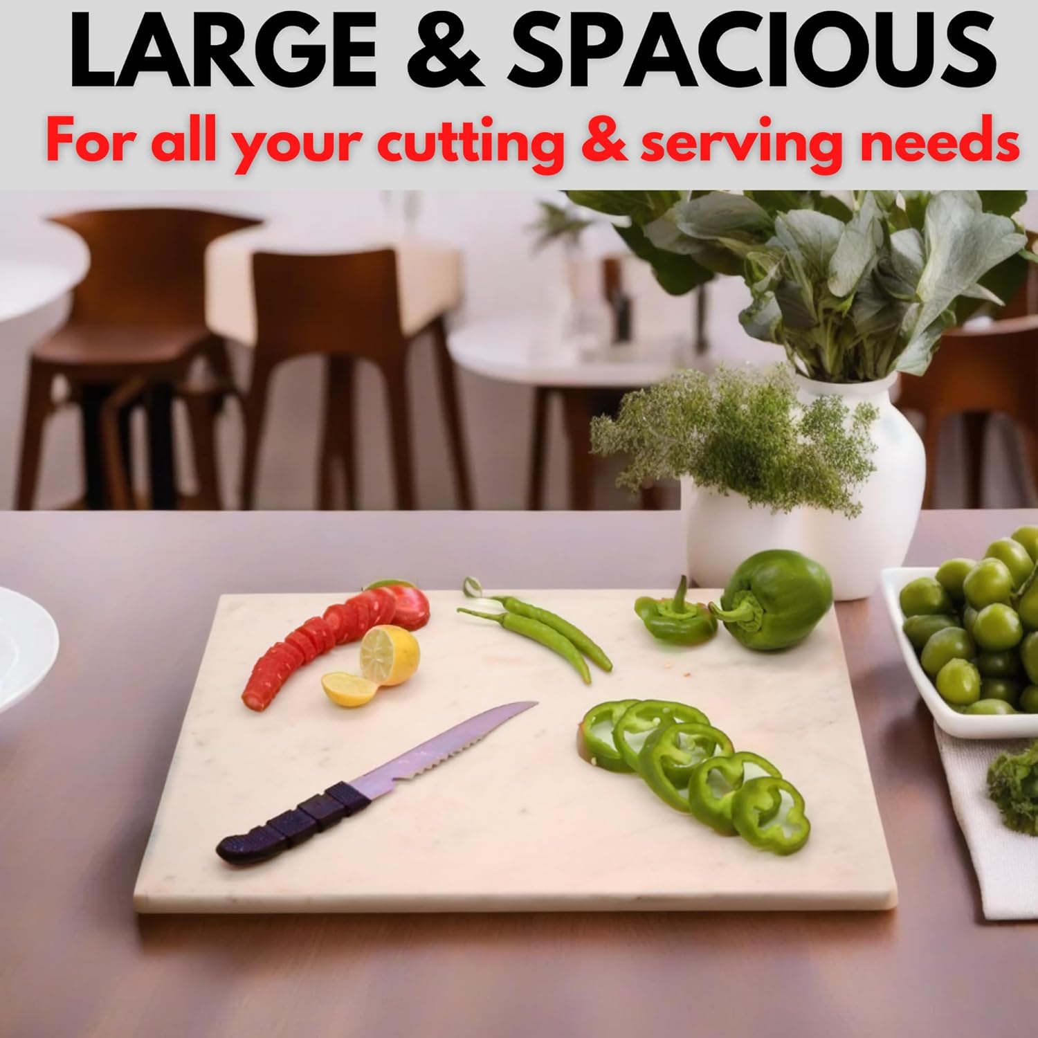 - Multipurpose Kitchen & Serving Board Use this all-in-one board as a cutting surface for fruits and vegetables, a pastry station, or an elegant cheese or dessert serving tray. Its classic white marble finish enhances food presentation, making it perfect for parties, gatherings, or everyday use.