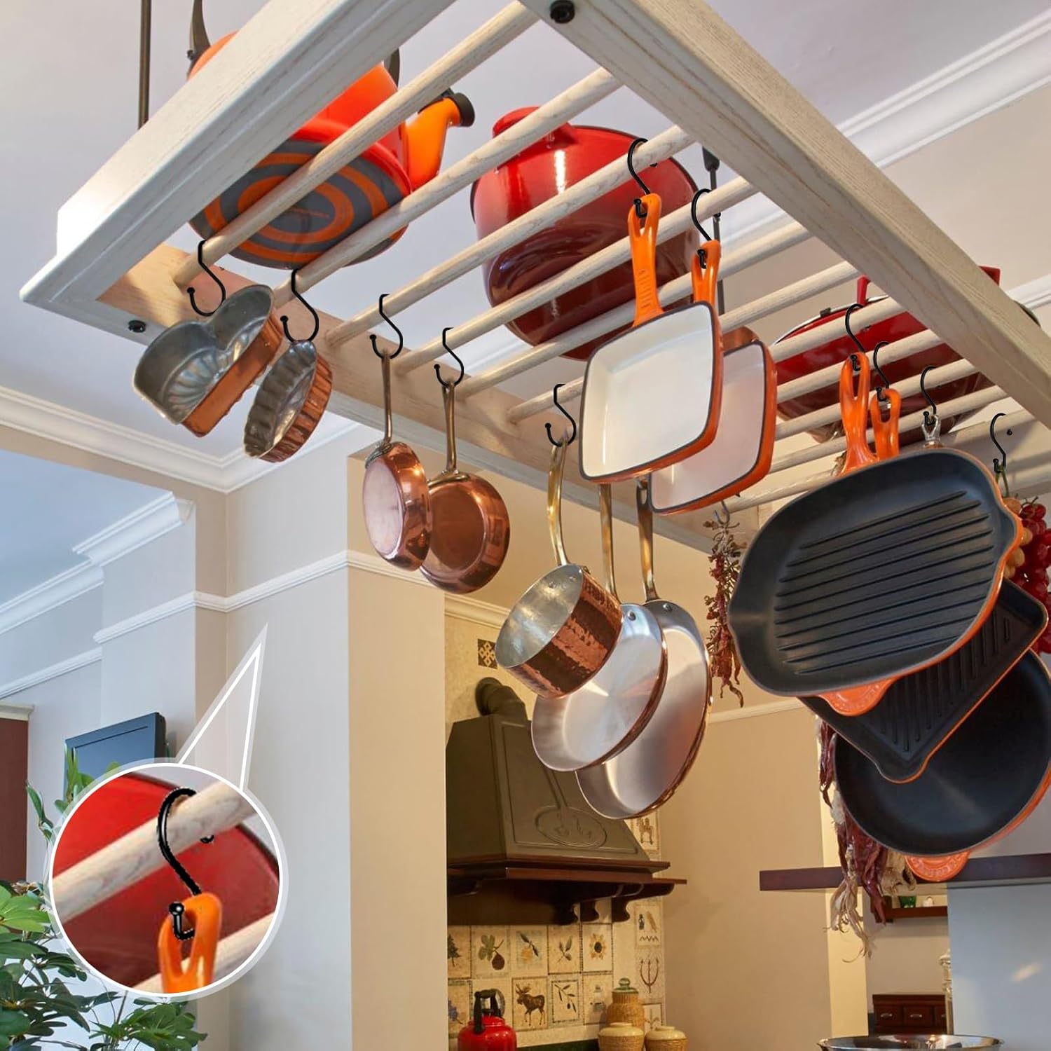 - Versatile Hooks: S shaped hooks holds well for pots and pans, oven mitts, mugs, towels, curtains, pants, caps, tools, crafts, plants, baskets, wreaths, garlands; can be used around the house like pantry, kitchen, bathroom, laundry, garden, garage, camper, RV, trellis, fence, gutter, deck; functional storage hooks with many uses, really serve its purpose