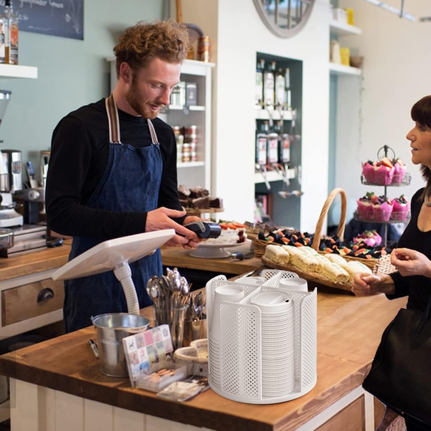 - 【Coffee Bar Storage】 The revolving cup dispenser has 4 compartments that can be used to separate coffee cups and lids, can also be used as a straw holder for customers to use, and even place some decorative items to keep your coffee bar organized.
