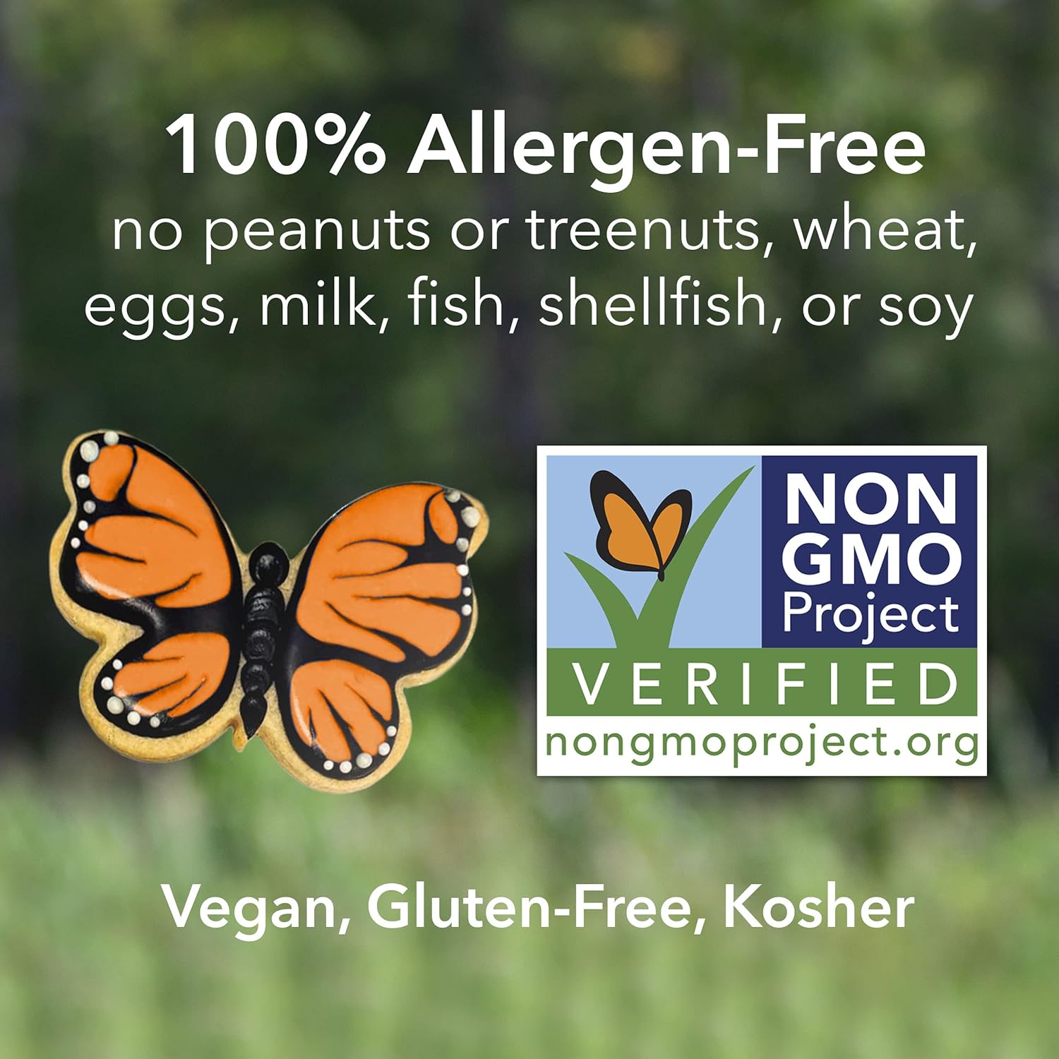 - Allergen Free: No peanuts, tree nuts, gluten, eggs, dairy, soy, fish or shellfish. Non-GMO, Kosher, and vegan.