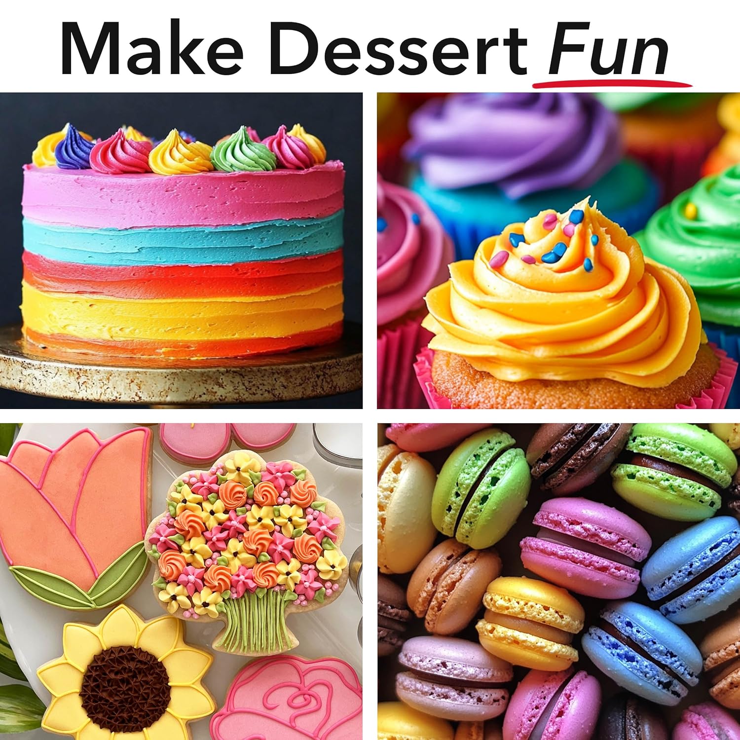 - Vibrant Colors: Brighter, more concentrated food coloring gel for icing, frosting, cakes, cupcakes, and cookies. One bottle colors enough icing for over 200 two-layer cakes!