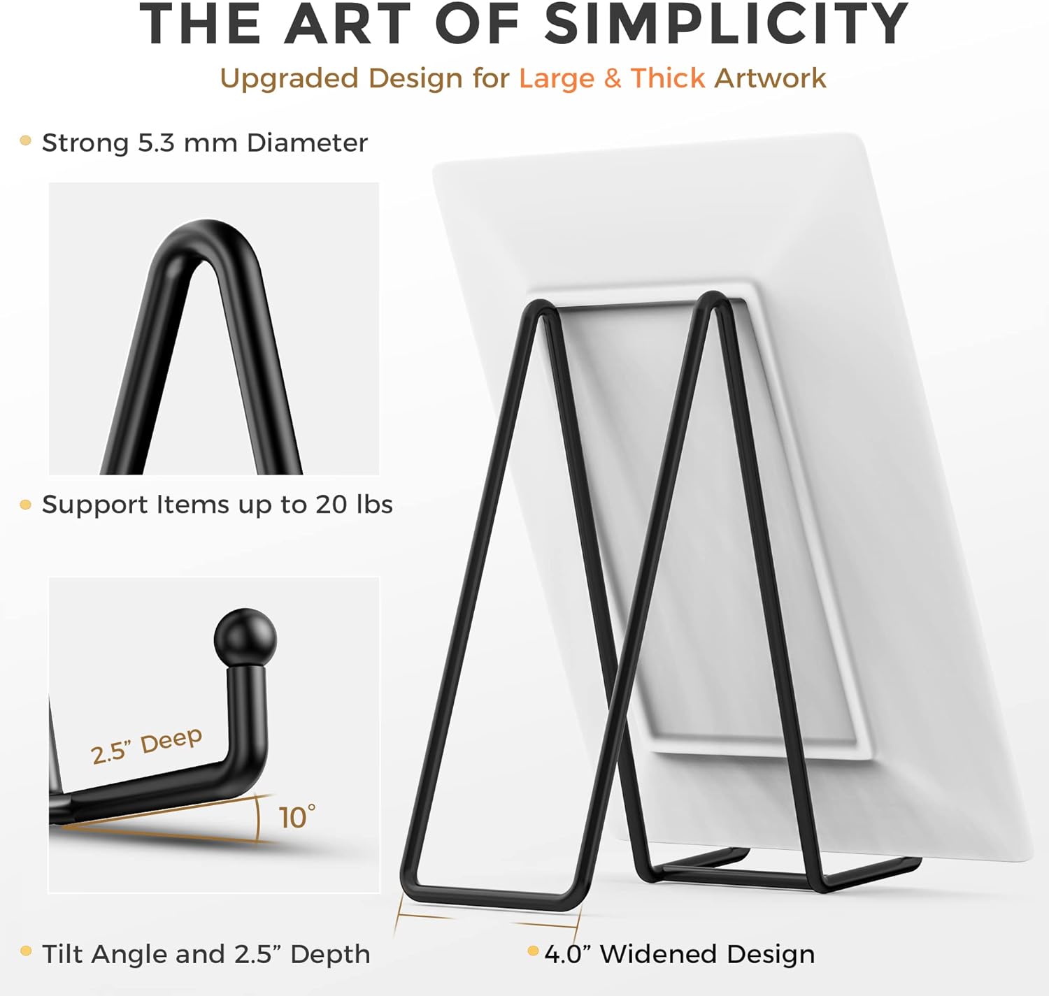 - STURDY DESIGN: - Made with wrought iron construction and a matte black powder-coated finish, this plate display stands features a reliable 8" depth and 4" widened base design, capable of securely displaying a variety of large items such as decorative plates, platters, plaques, photo frames, trays, tiles, cutting boards, cookbook, sign, canvas art, and more.