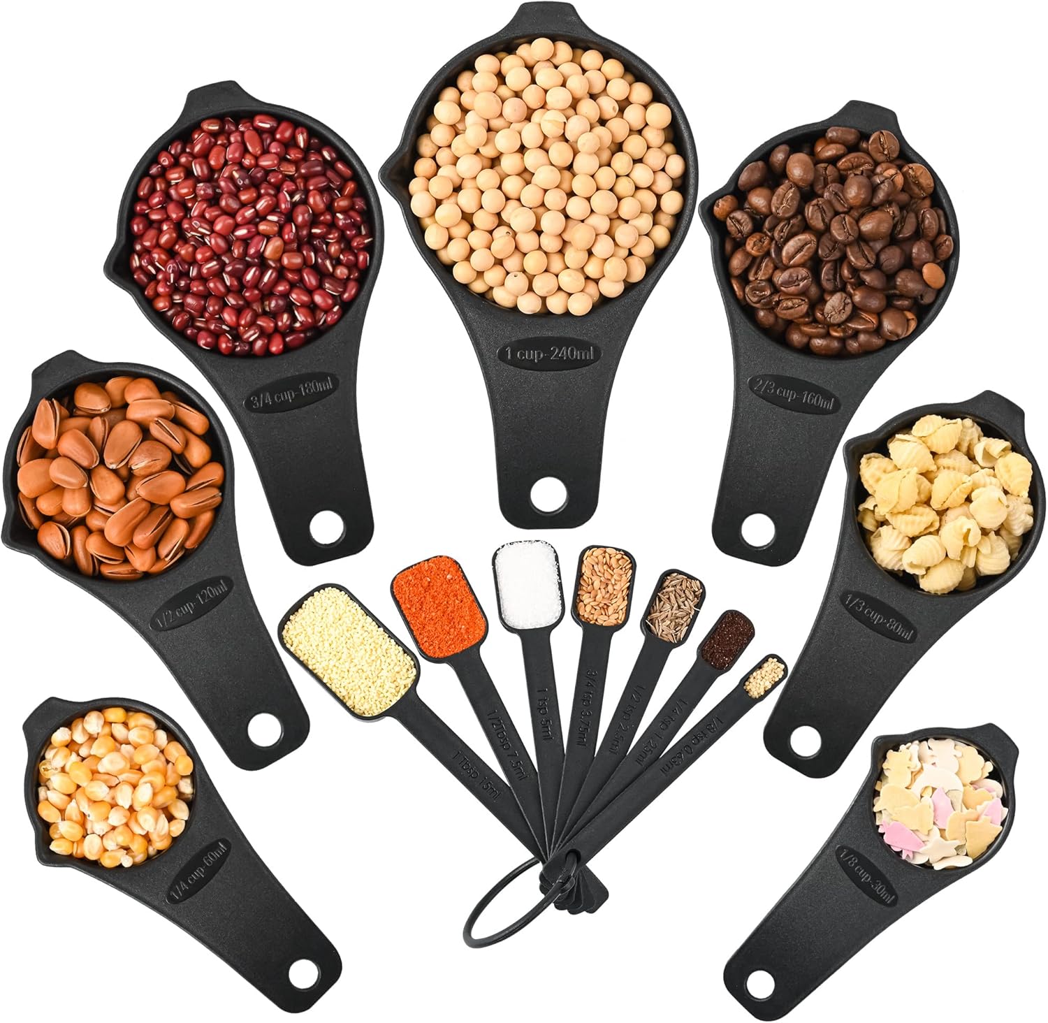 Measuring Cups and Spoons Set 15, 7 Plastic Measuring Cup Spoon Set, 7 Spice Long Handle Measuring Spoons with 1 Leveler for Kitchen and Baking, Dry Metric Measure Cups & Spoons Black