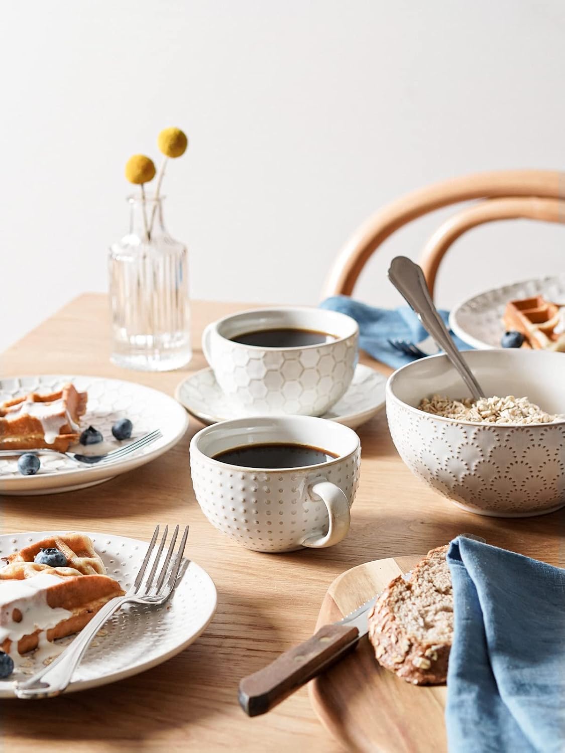 - Four Different Pattern Design: The outside of the cups are embossment which have four styles. The inner glaze is a smooth ceramic surface. . New homeowners will like the timeless farmhouse look of these bowls.Enough space for a coffee spoon and biscuit while enjoying a cup of lungo coffee