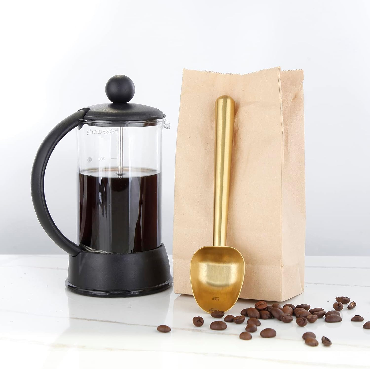 - [Quality & Design]Being made from 304 food grade stainless steel ensures it will never rust, corrode or crack and polished to perfection with a beautiful champaign gold color. This unique coffee scoop design and tapered edge makes it easy to measure coffee and tea from the bag.