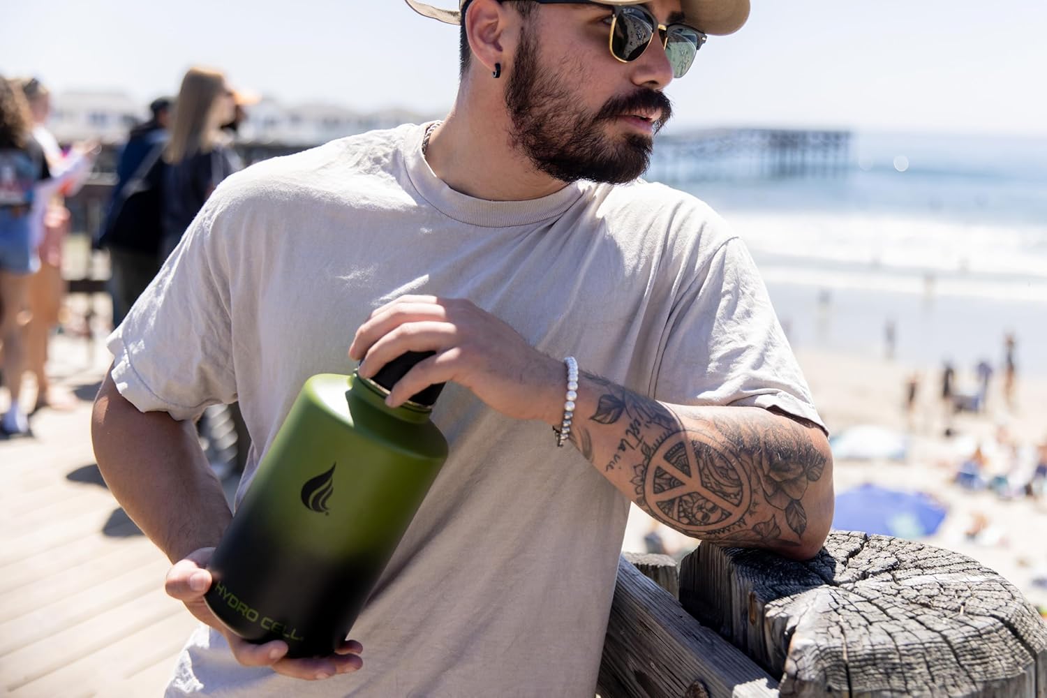 HYDRO CELL Stainless Steel Insulated Water Bottle with Straw - For Cold & Hot Drinks - Metal Vacuum Flask with Screw Cap and Modern Leakproof Sport Thermos for Adults (Army/Black 64oz)