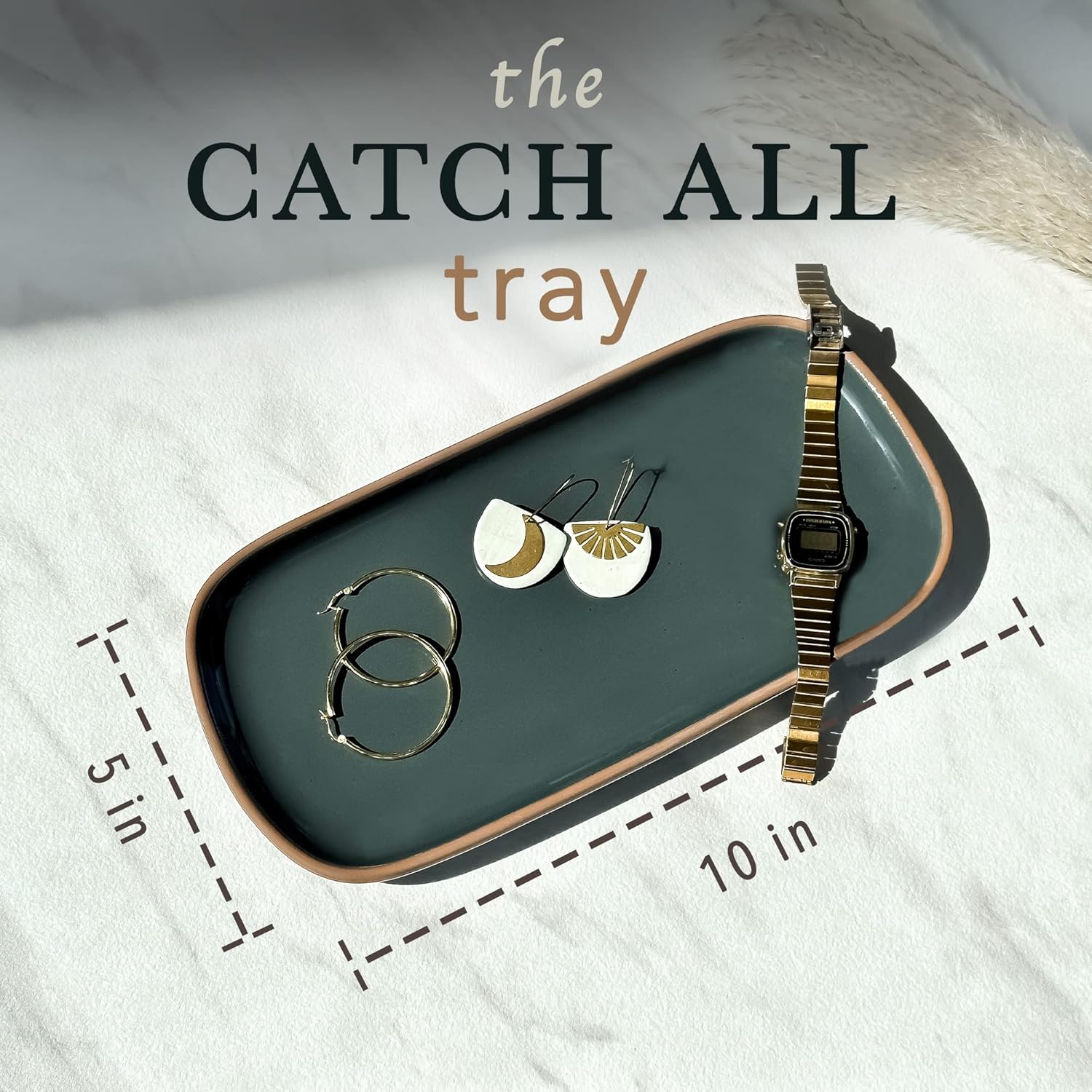 - VERSATILE USES: We all love a multi-functional object. Trays are all the rage right now and with good reason. Storing things on a tray gives a minimal and organized aesthetic and can be used for an endless amount of things. Your stationary, soap dispensers, brushes, candles, cosmetics, jewelry etc all deserve a beautiful home. The glaze is also food grade and work great for serving cheese, sushi, mini cakes, etc.