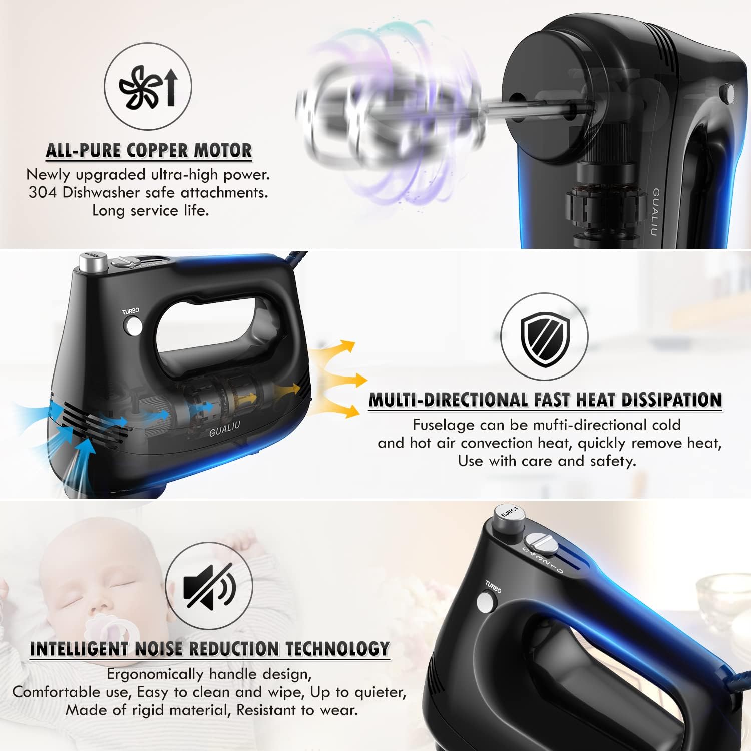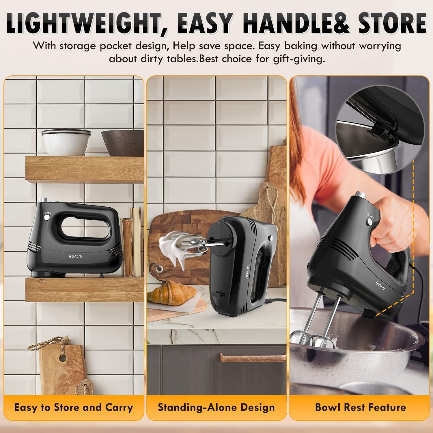 - ๐งใ๐๐ฎ๐ซ๐๐จ ๐๐จ๐จ๐ฌ๐ญ & ๐๐๐ฅ๐-๐๐จ๐ง๐ญ๐ซ๐จ๐ฅ ๐๐ฉ๐๐๐ใ: GUALIU hand mixer features a 5-speed self-controlled speed and an additional turbocharging feature that allows you to choose the best mixing speed for any recipe. Suitable for whipped cream, butter, egg whites and batter, as well as mashed potatoes and other dishes!