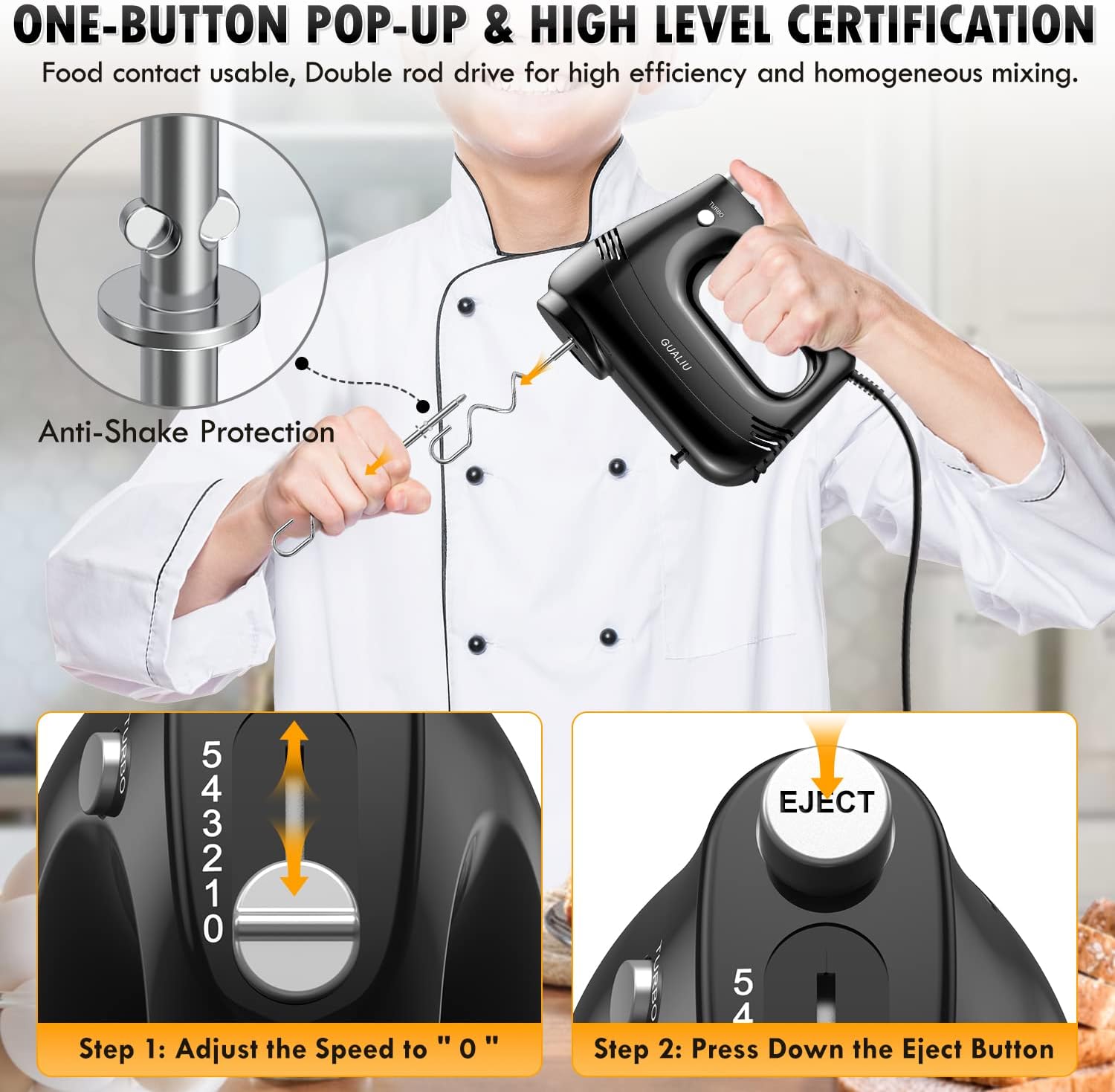 - ๐ฅงใ๐๐ฃ๐๐๐ญ ๐๐ฎ๐ญ๐ญ๐จ๐ง & ๐๐ง๐๐๐ฉ๐๐ง๐๐๐ง๐ญ ๐๐ง๐ ๐ฉ๐จ๐ซ๐ญ๐๐๐ฅ๐ใ:Our hand mixer electric handheld have one-click pop-up design for quick replacement and cleaning of accessories. (Please set the speed to "0" speed) The upright position design makes the handheld mixer easy to shelve, saving valuable space in your kitchen. Bake with ease and don't worry about dirtying the table. ๐งใ๐๐จ๐ญ๐ใThe hand mixer cannot work continuously for more than 5 minutes and let it cool to room temperature before using again.