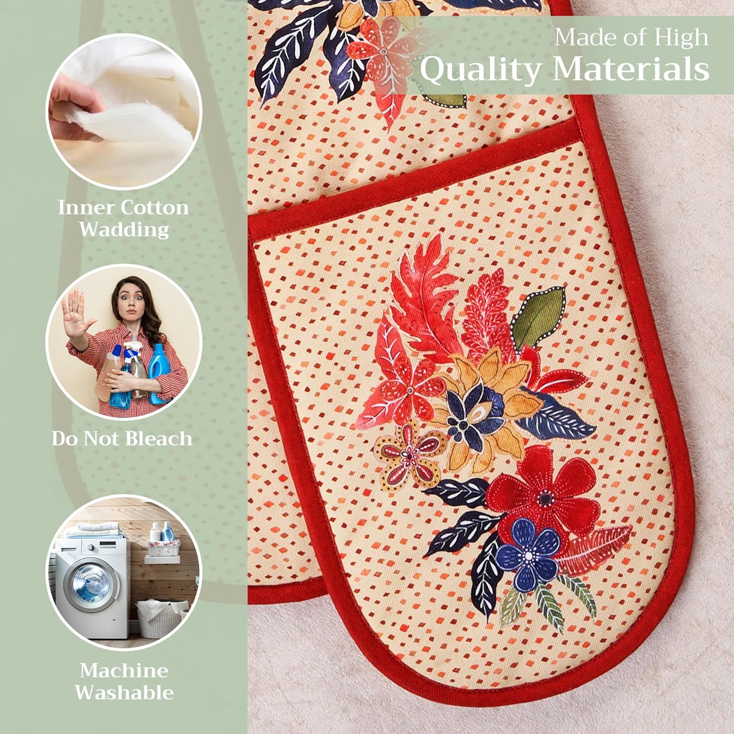 - 100% Quilted cotton: Crafted from premium quilted cotton for superior heat resistance and durability. This double oven mitt offers a soft, flexible grip and protects your hands during baking, roasting, or grilling