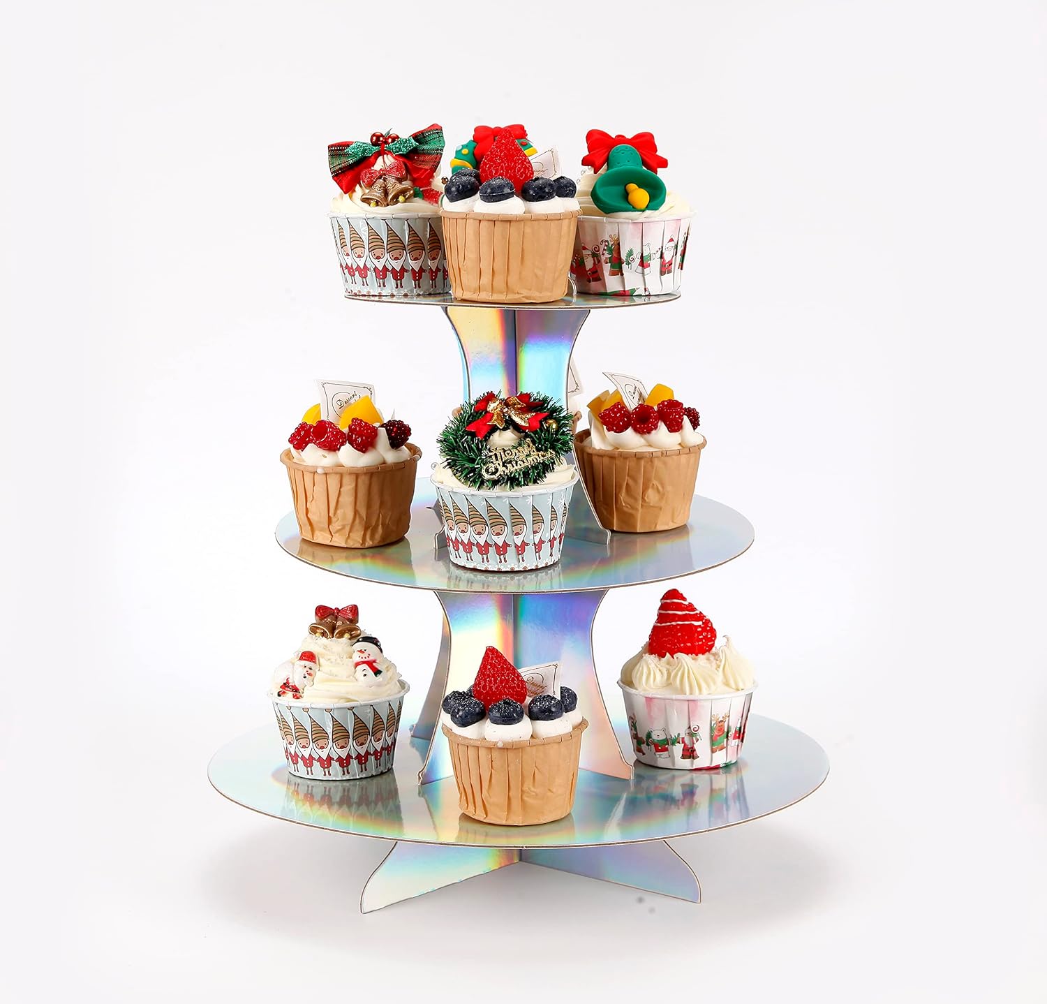 - 【Dessert Display】— This stacked 3-tier cupcake tower will be a big hit at your next party. Use this stand to display cupcakes, cookies, candies and fruit, or use it for appetizers like cheese and crackers. Three stacking sections disassemble easily and nest together for storage.