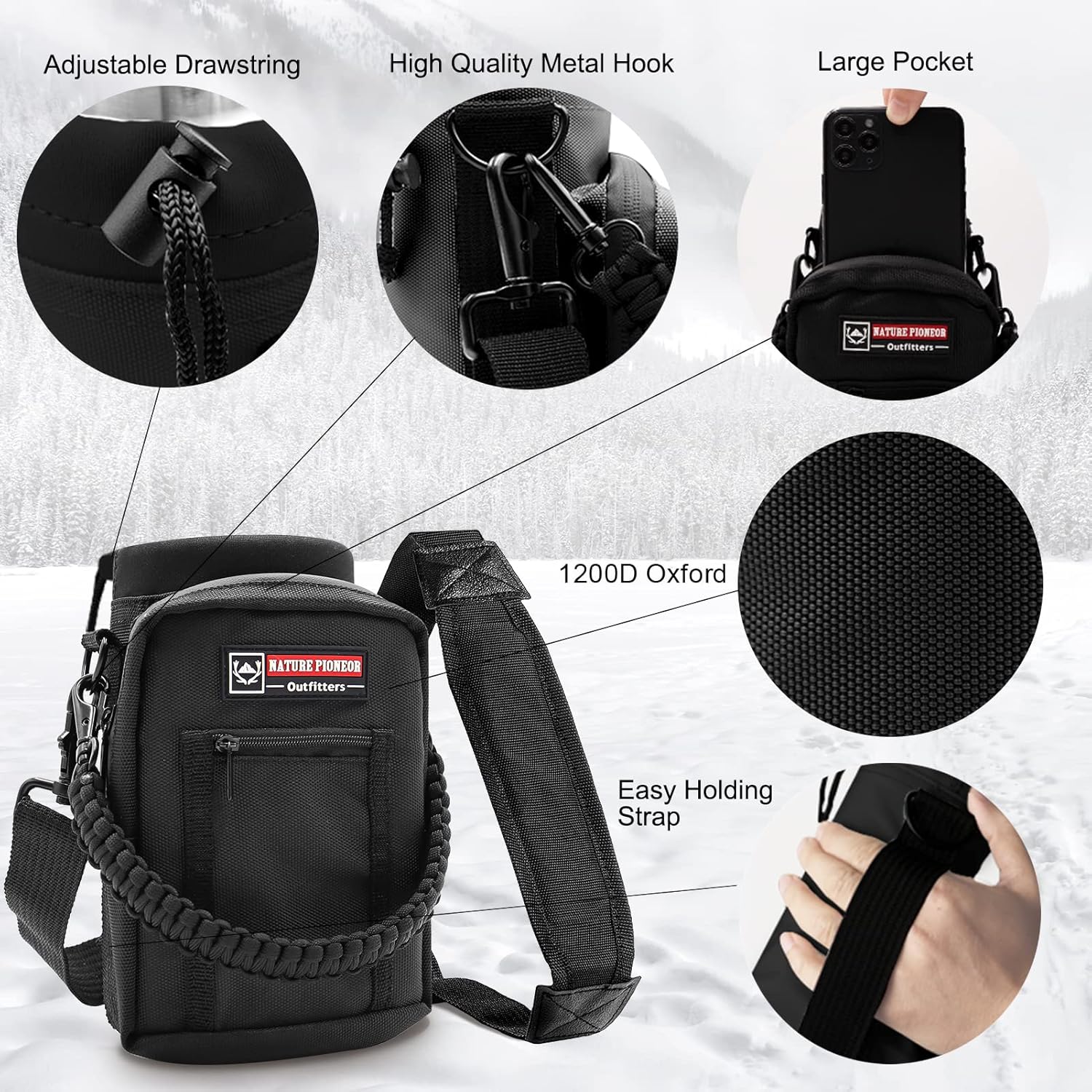 - 【Portable Water Bottle Holder】 – To make carrying easier, this water bottle comes with a handmade paracord handle and adjustable shoulder strap for hands-free convenience. The holder includes a zippered storage pocket for small items like keys, cards, or snacks, and a side hook for accessories. Whether you’re going on long hikes, outdoor adventures, or traveling, this bottle + carrier set offers both functionality and style