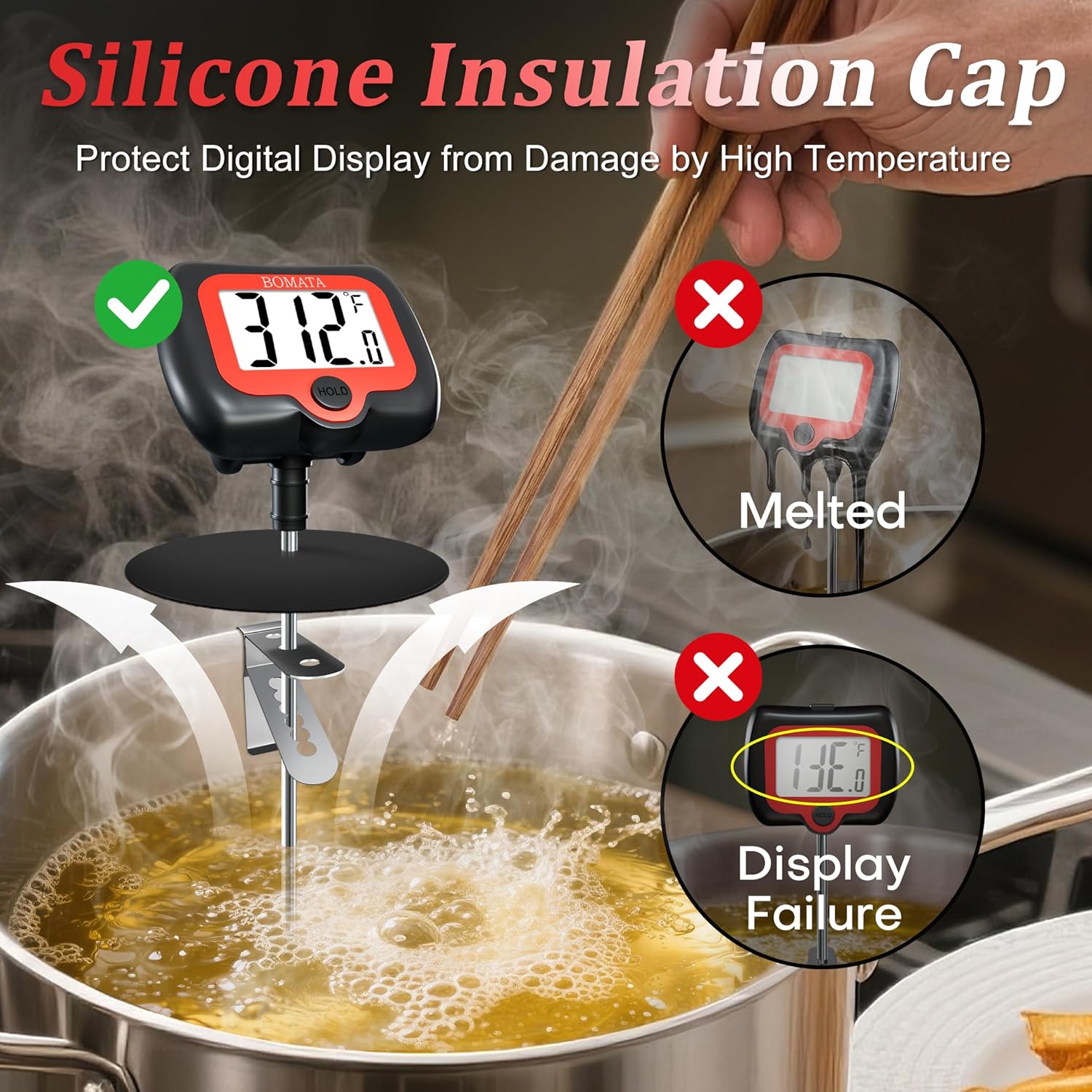 - [ Upgraded Silicone Insulation Cap ] For continuous use at high temperatures, this deep frying oil thermometer is specially equipped with a silicone insulation pad to prevent it from melting or the electronic components from being damaged due to continuous hot steam.