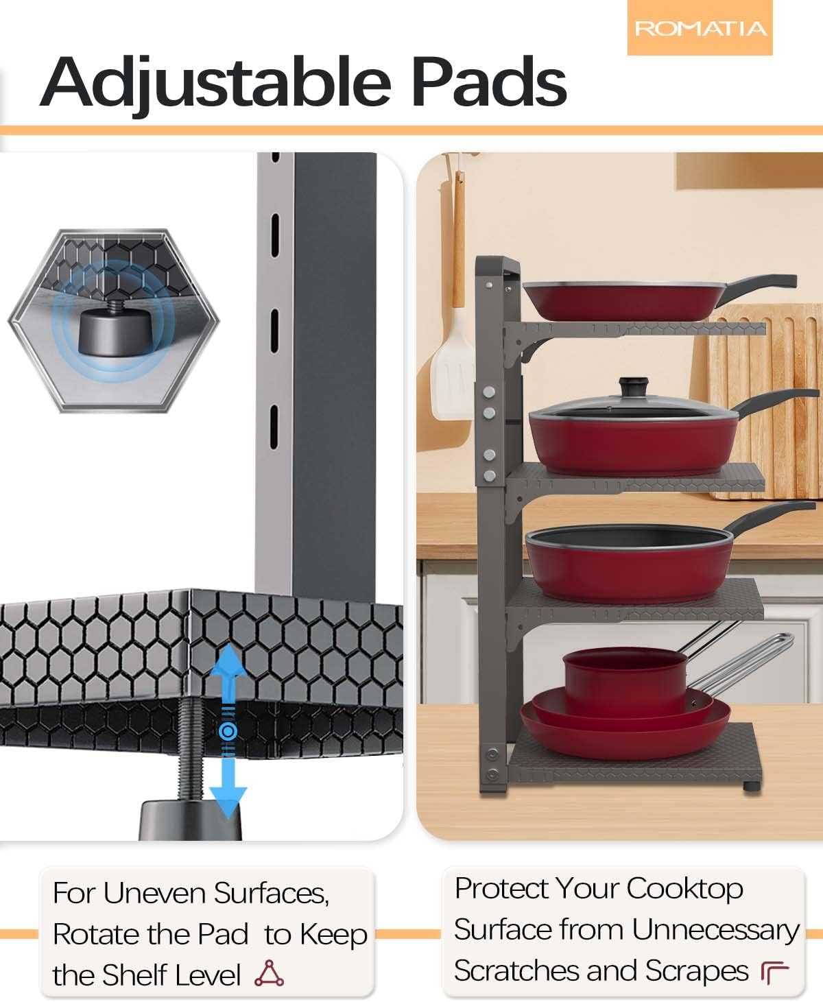 - [Excellent Details] For slightly uneven surfaces, rotate the pad on the bottom to keep the shelf level. Meanwhile, the pad can protect your cooktop surface from unnecessary scratches and scrapes. Rustproof pan holder are easy to clean.