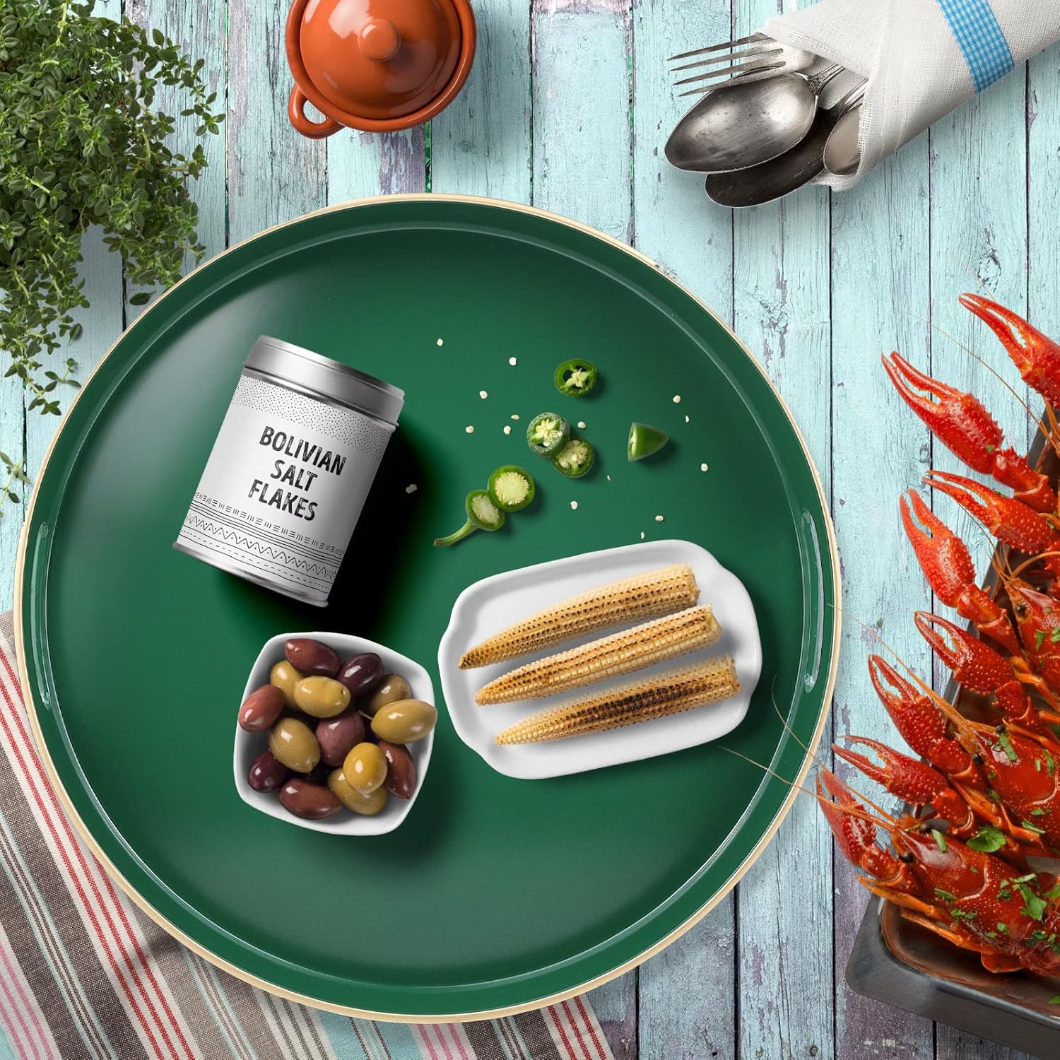 Green Round Decorative Tray with Handles, 13" Versatile Serving Tray for Coffee Table, Ottoman, Ideal for Serving, Displaying, Organizing
