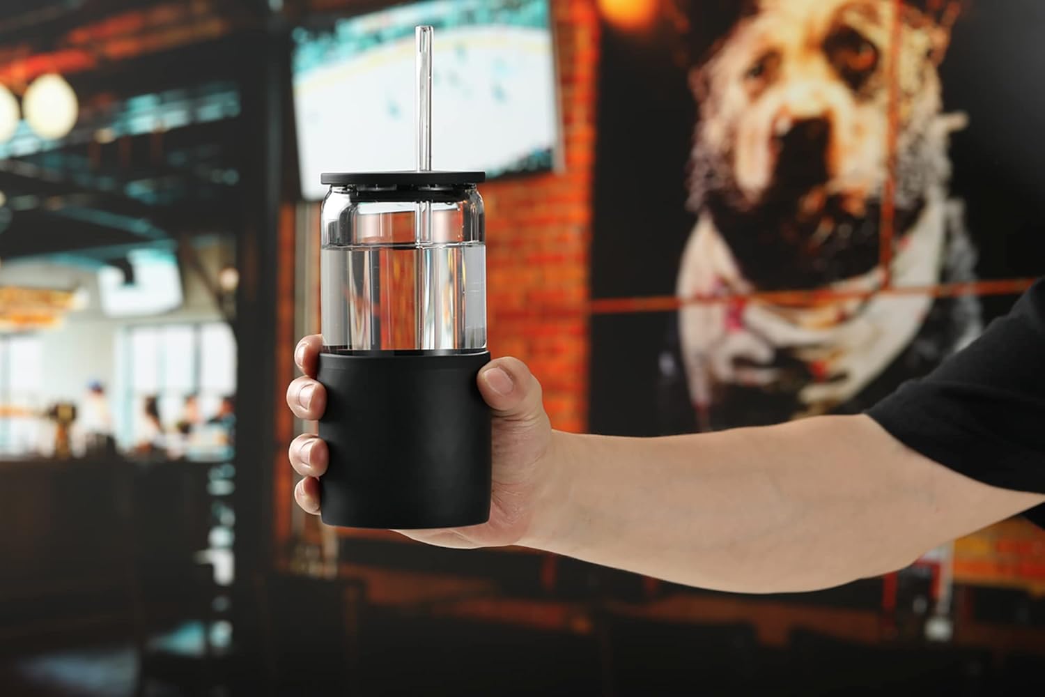 - The unique silicone sleeve and lid design provides a strong protection for the glass cup. if the glass cup is accidentally turned over on the desktop, the chance of breaking is very small, and the sealed lid ensures that the liquid will not overflow.