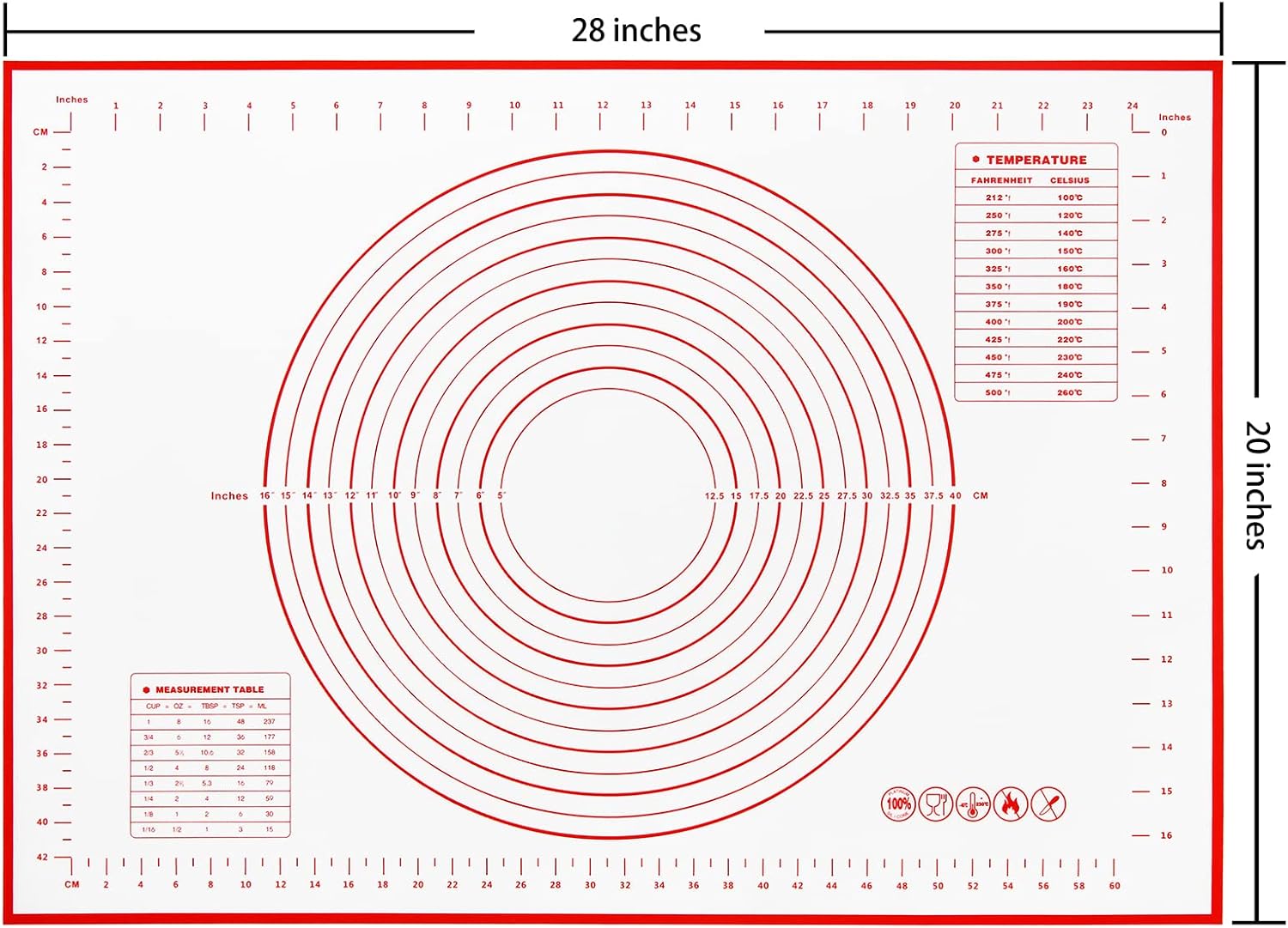 Yansumi Silicone Pastry Mat Extra Large Non-Slip Mat for Rolling Dough Pie Crust and Baking Non-Stick with Measurements(XL,28"L x 20"W, Red)