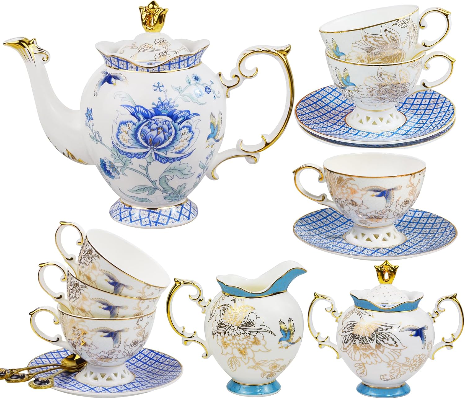 - Refinement and elegance: Our English tea set is a representative of elegance, delicate blue flowers with elegant gold tracery makes people attracted by its beauty at a glance, if your friends come to your home to visit you will be surprised by the appearance of this tea set!