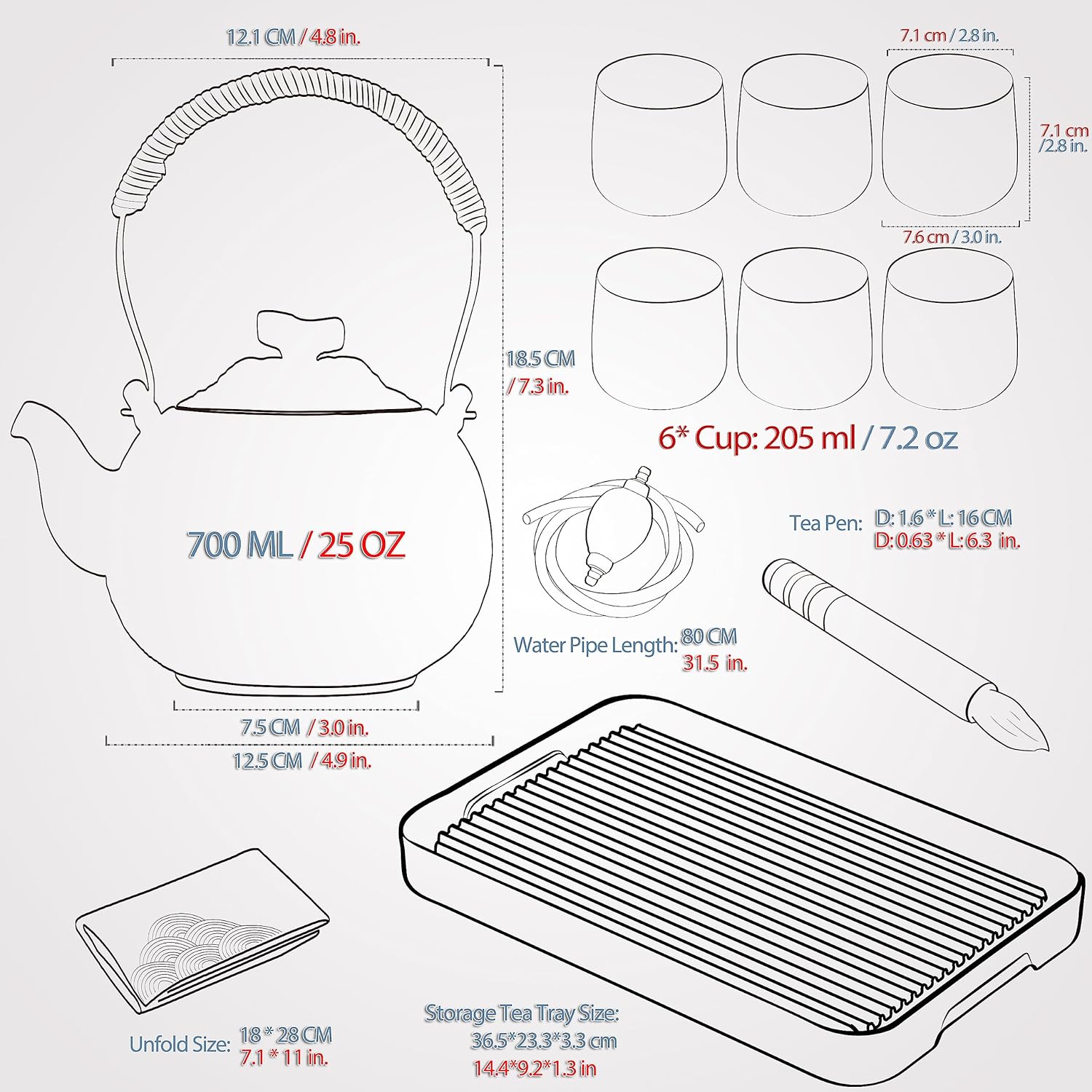 - COMPREHENSIVE SET CONFIGURATION:The Chinese gongfu tea set includes 1*700ml/25oz teapot, 6*205ml/7.2oz tea cups, a 304 stainless steel filter, a plastic multi-funcation tea tray, an embroidered Japanese-style wave tea towel, a Black Sandalwood Tea Pen, a Drainage pipe with water-absorbing ballWith this complete set, you have everything you need to enjoy a delightful tea experience.The adorable and rustic design of the entire tea set adds practical, artistic, and collectible value.