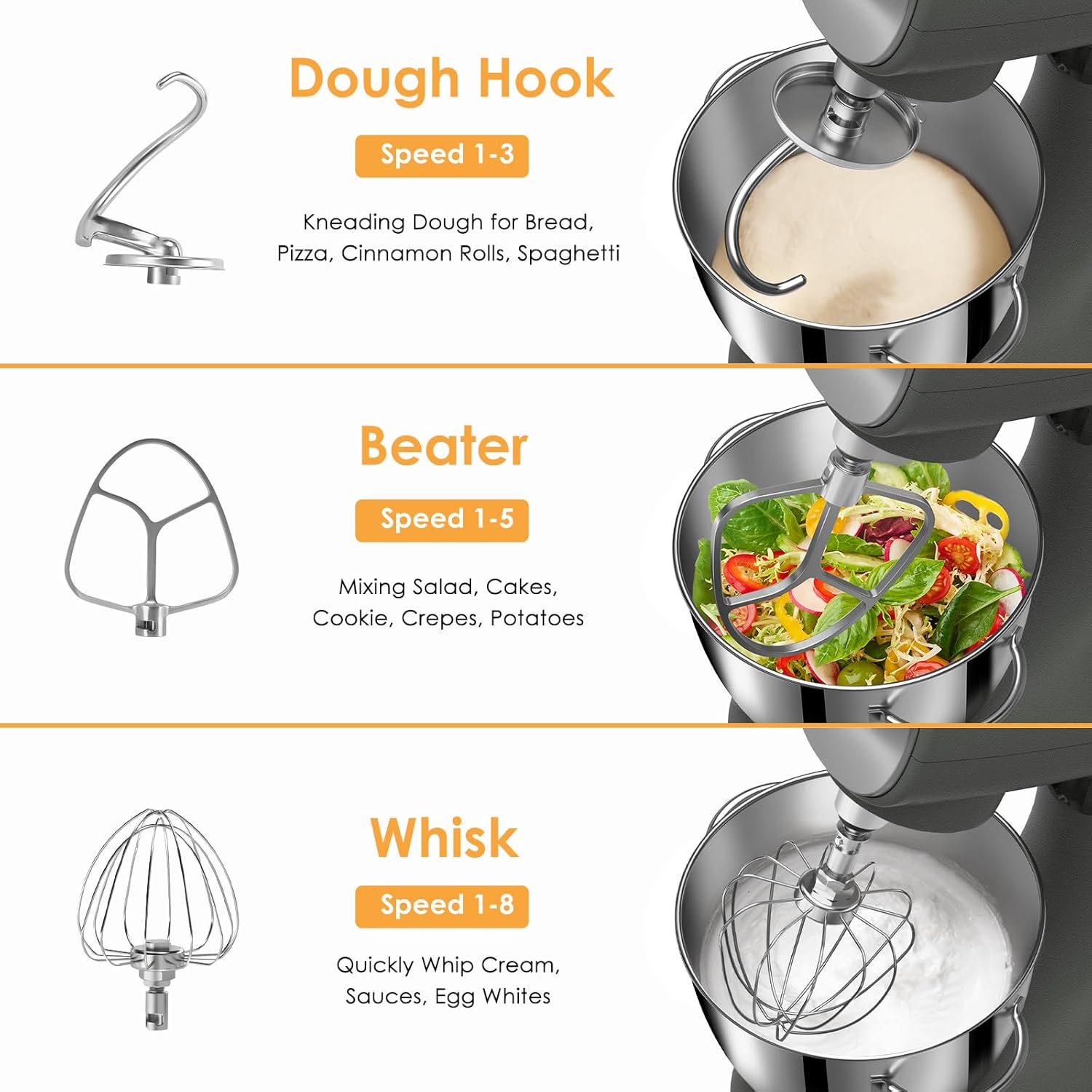 - 【6 Ingenious Designs for Easy to Use】1.All accessories of the mixer for baking are dishwasher safe. 2.The tilt-head design of the electric stand mixer is easy to adjust. 3.The lighting of cake mixer is convenient to check the mixing status. 4.The low-noise high-torque DC motor makes the mixing sound less than 70 dBa. 5.The 8-level constant speed control is suitable for various recipes, and knob adjusts smoothly. 6.The display screen shows the mixing time and can be timed.
