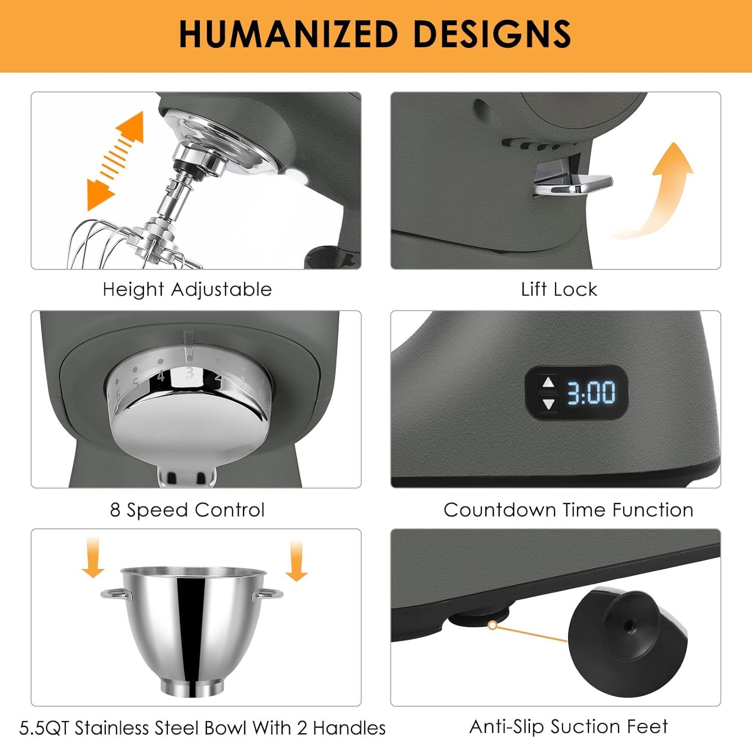 ZACME Mixers Kitchen Electric Stand Mixer 5.5QT 600W, Aluminum die casting and Gears, Dual Cooling System, Low Noise, DC Motor, LED Display and Timing Function, Tilt-head Metal Food Mixer, Grey