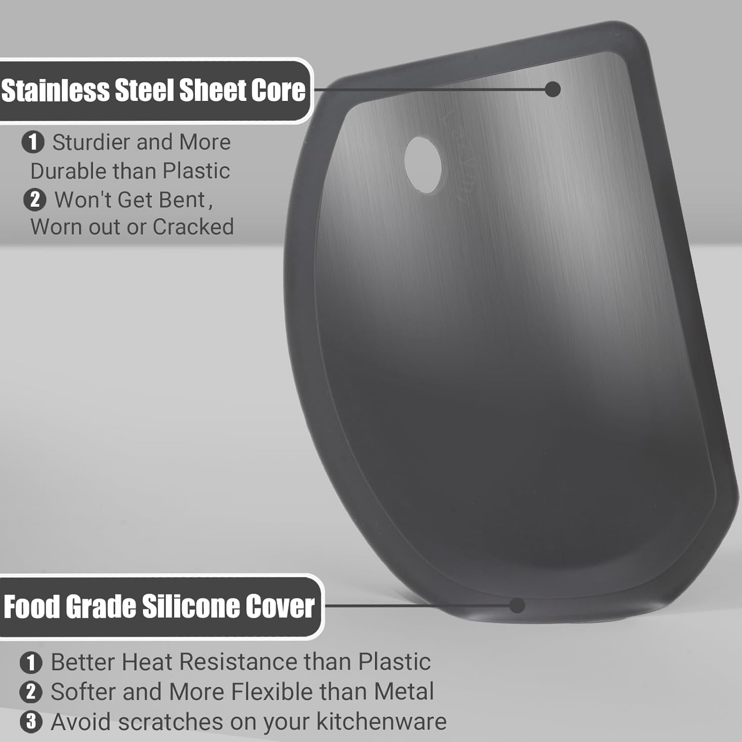 - Silicone Cover and Stainless Steel Core : Inside the pastry scraper is sturdy stainless steel sheet, compared with other flimsy plastic scraper, our baking scraper won't get bent, worn out or cracked. It is more durable and has longer service life. The covering surface is made of food-grade silicone, which has great flexibility and heat resistance. Unlike metal dough cutter, which are too stiff and sharp, silicone scraper can avoid leaving scratches on your kitchenware or hurting your hands.