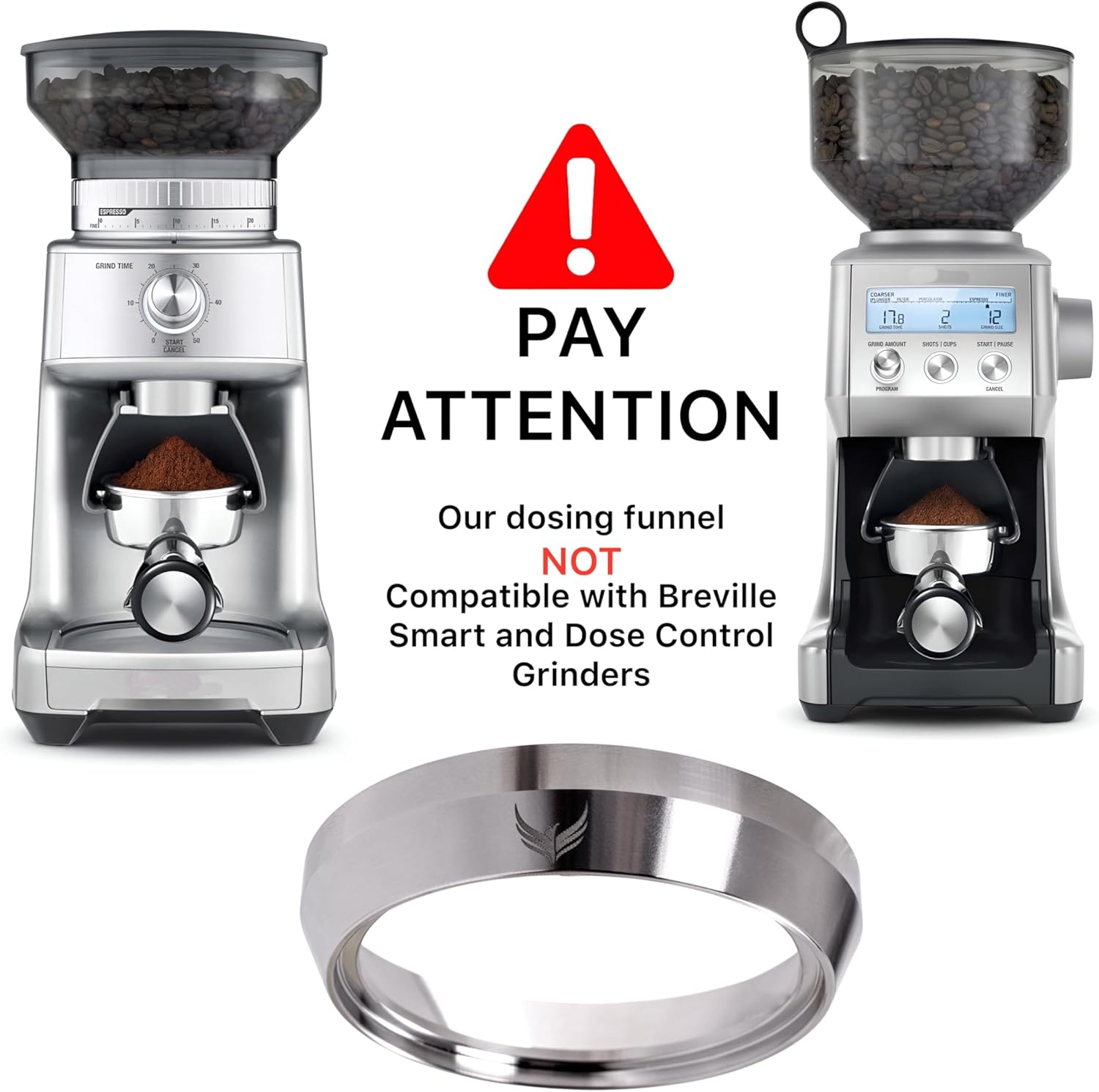 - VERY IMPORTANT ! The 54mm tamp through portafilter funnel does not fit the integrated grinder slot in Breville Barista Express, Pro ,Touch, Impress and Breville Smart Dose Grinders . We recommend this funnel for breville machine users who use a separate grinder