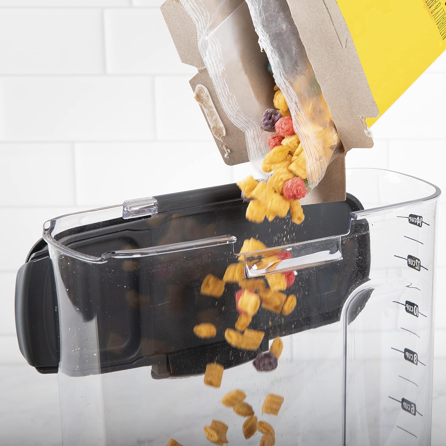 - Holds a standard-size cereal box. Wide mouth pour spout is great for pouring all cereal types. Features a silicone seal for airtight storage. Flip & pour spout and contoured body provide ease of use. Measurement markings up to 14 cups indicate the remaining cereal. Dishwasher safe with a 4.2 QT (4.0 L) capacity.