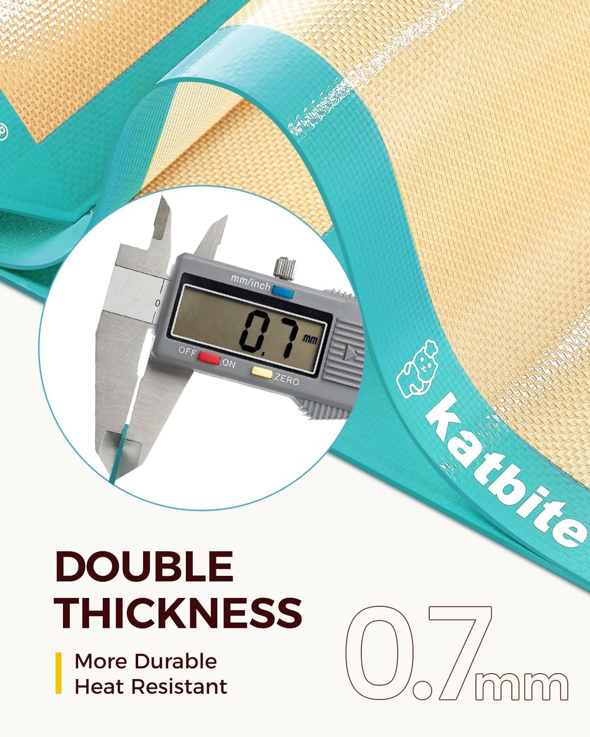 - 𝐃𝐎𝐔𝐁𝐋𝐄 𝐓𝐇𝐈𝐂𝐊𝐍𝐄𝐒𝐒: Experience culinary confidence with our DOUBLE THICKNESS silicone baking mats. Boasting a substantial 0.7 mm thickness (approx. 1/32"), they outmatch standard mats (0.3 mm) with unparalleled stability and durability. Say goodbye to slipping or wrinkling – our extra thick mats stand strong, ensuring your baking endeavors are flawlessly executed. Elevate your kitchen with quality you can rely on.