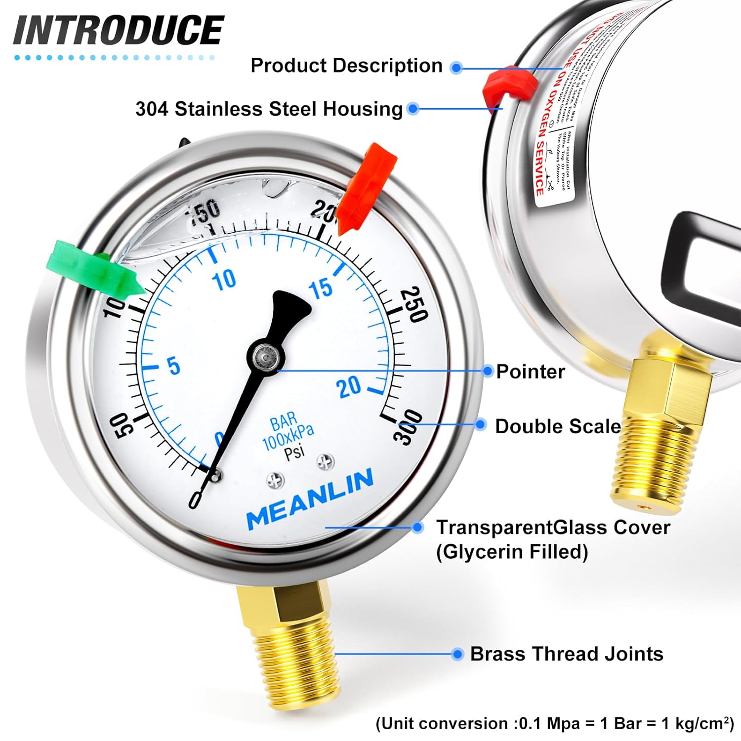 MEANLIN MEASURE 0~300Psi Liquid Filled Pressure Gauge 1/4" NPT 2.5" FACE DIAL Stainless Steel Glycerin Filled WOG Water Oil Air Lower Mount (with 2PCS Snaps)